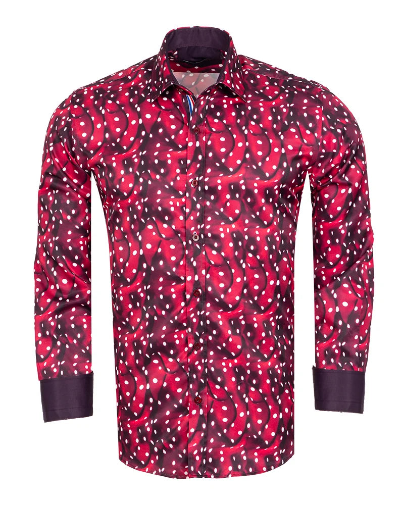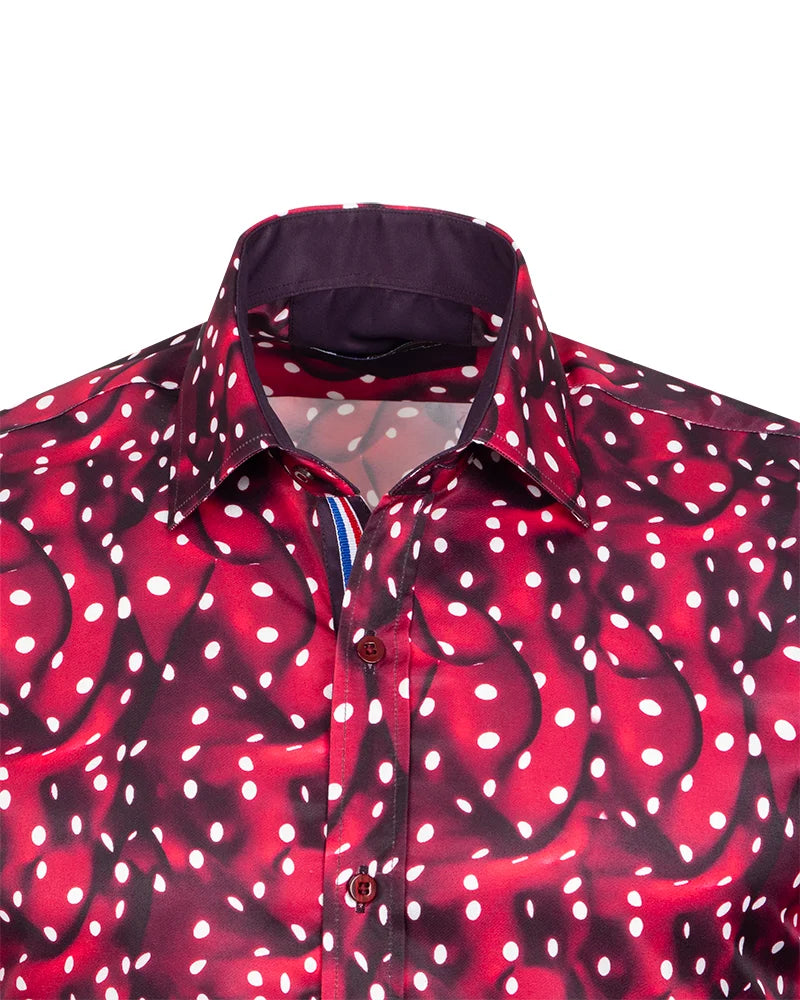 Introducing the Burgundy Abstract Polka Print with Matching Handkerchief, a truly unique addition to your wardrobe. Crafted from 100% satin cotton, this shirt offers a luxurious feel while ensuring comfort throughout the day.