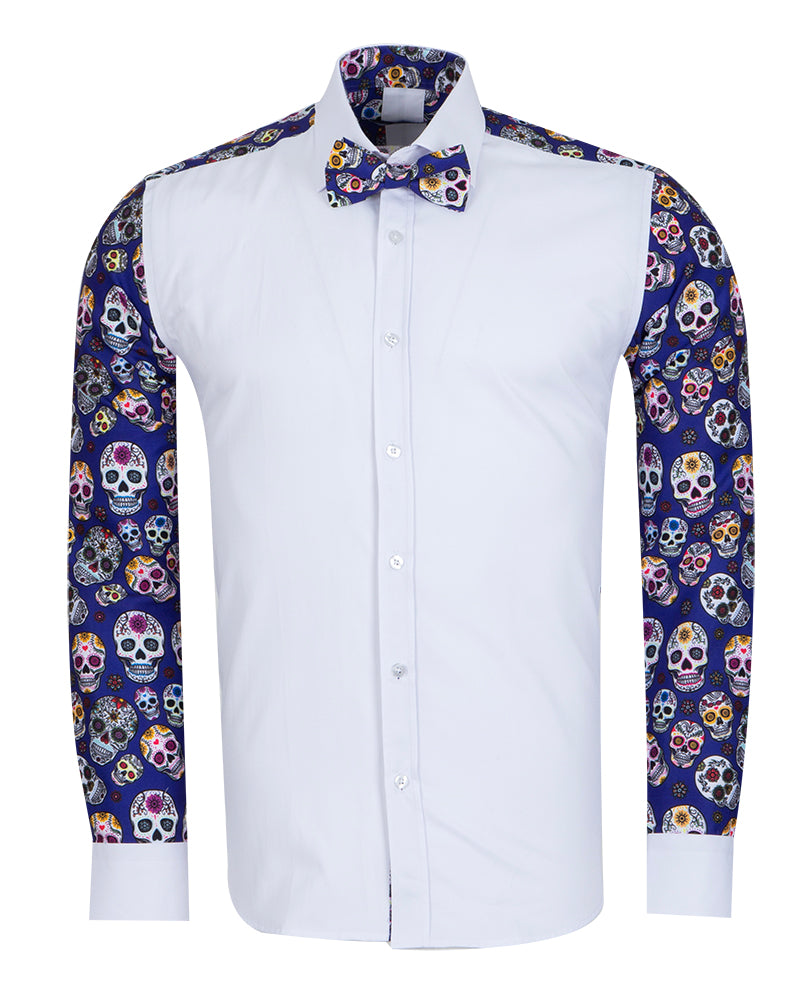 Introducing the Skull Print Tuxedo Shirt, a unique blend of style and sophistication. This shirt features a striking skull print design that adds a modern twist to traditional formal wear.