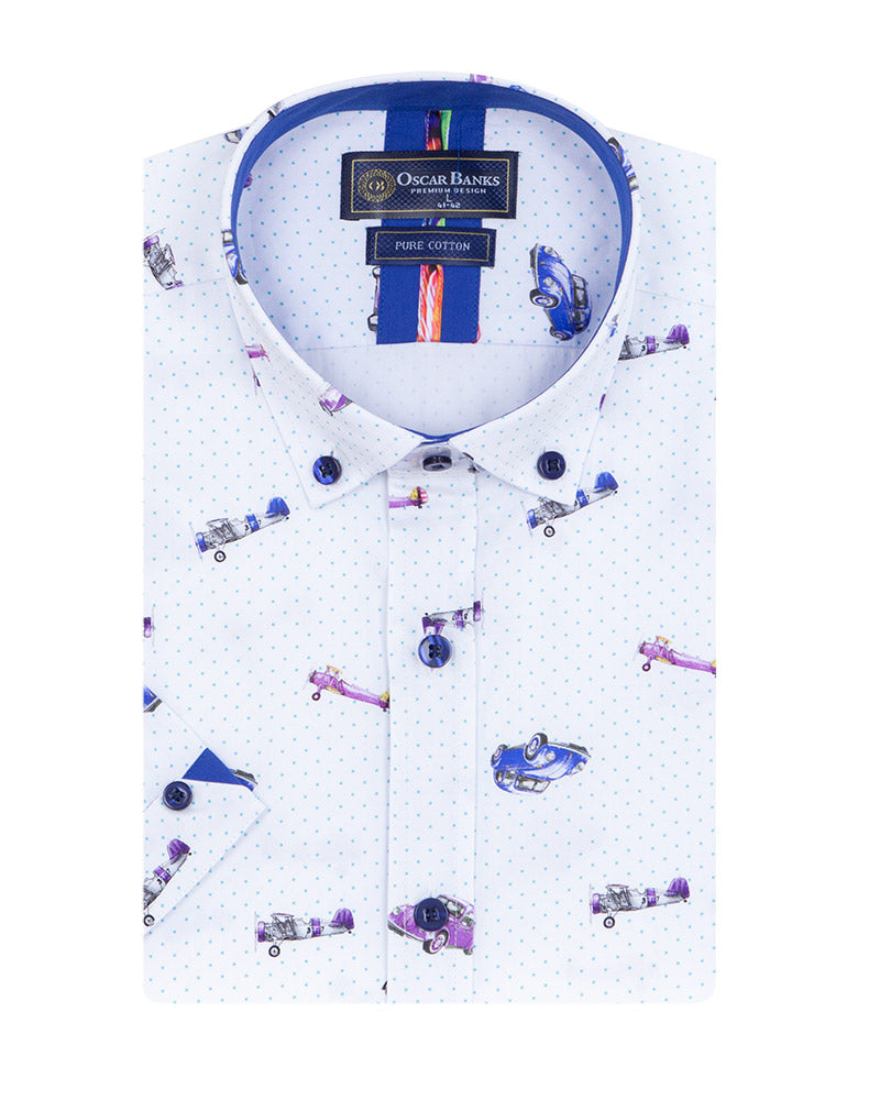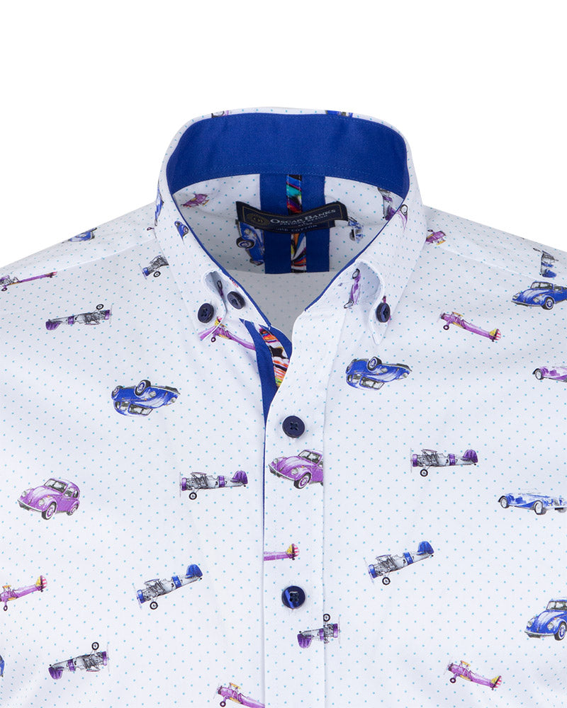 Featuring a unique flower print alongside classic car and airplane designs, it stands out in any wardrobe. The contrasting collar and sleeve inserts add a touch of sophistication, while the button-down collar ensures a polished look.