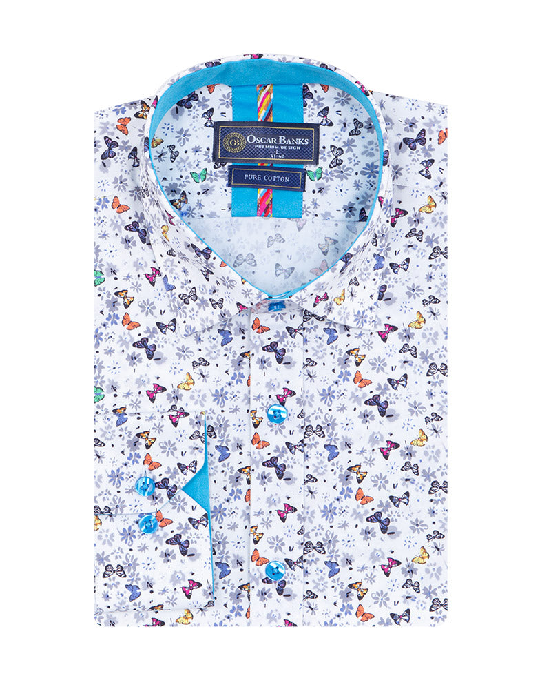 Elevate your wardrobe with the White Butterfly Print Shirt, designed for the modern man who appreciates style and sophistication. Crafted from 100% satin cotton, this shirt offers a luxurious feel and exceptional comfort.