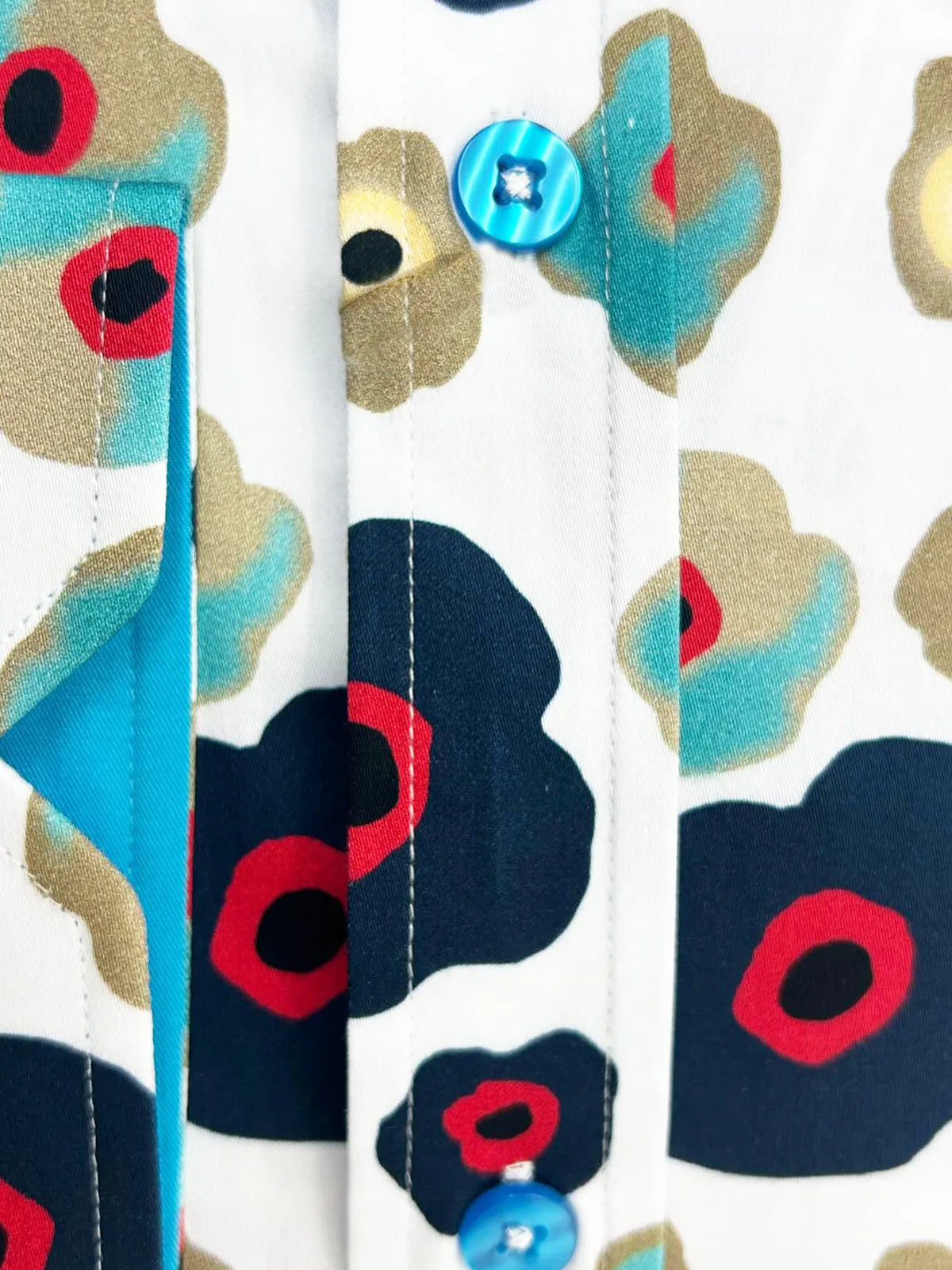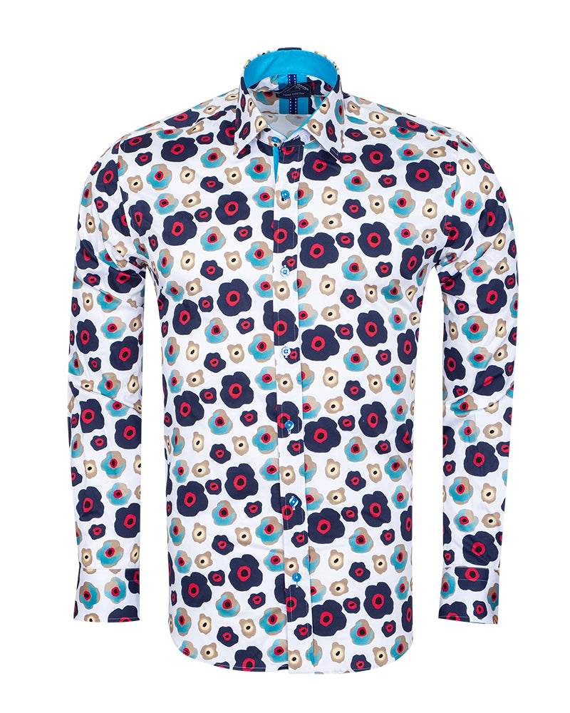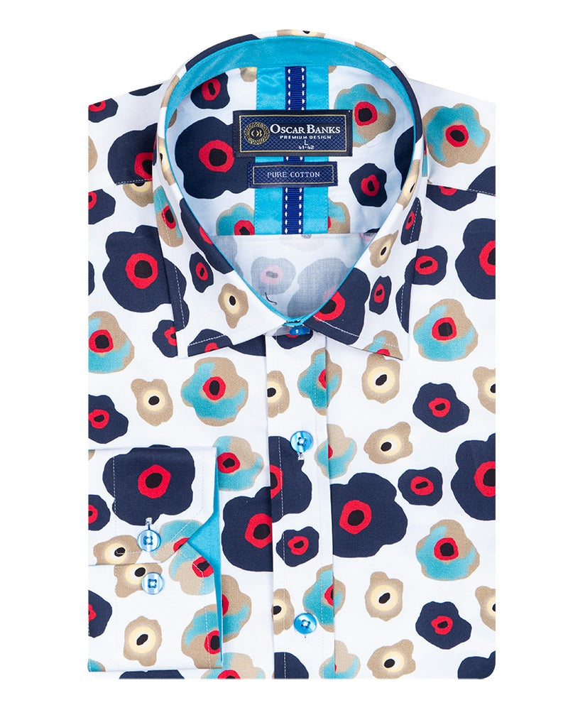 Introducing the White Colourful Abstract Shapes with Matching Handkerchief, a truly unique addition to your wardrobe. Crafted from 100% satin cotton, this shirt offers a luxurious feel while showcasing a vibrant abstract design that stands out.