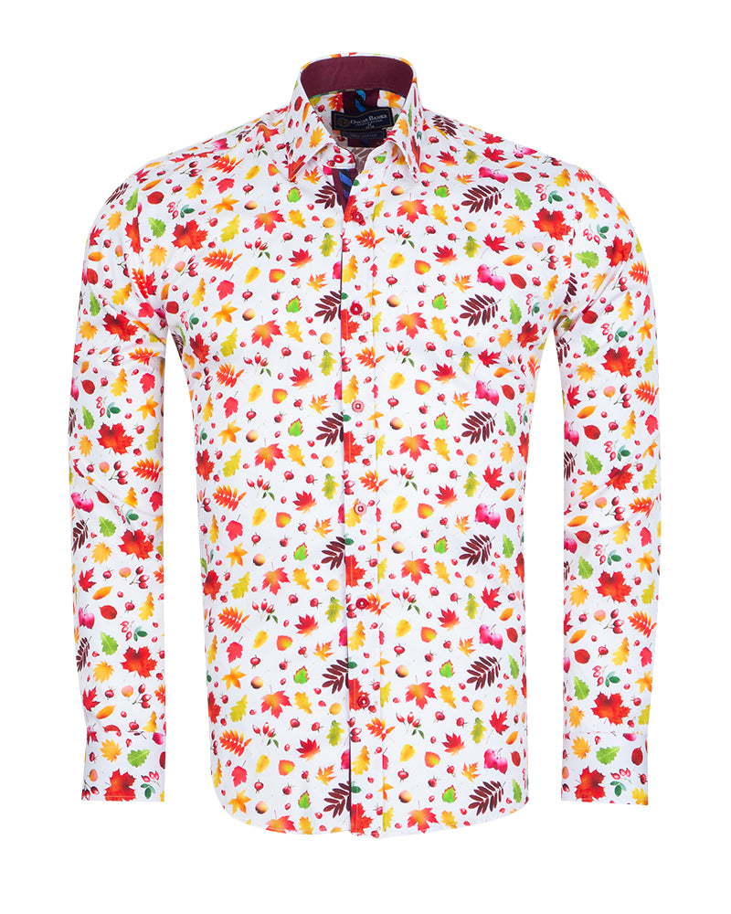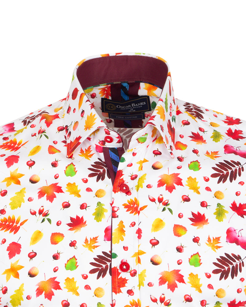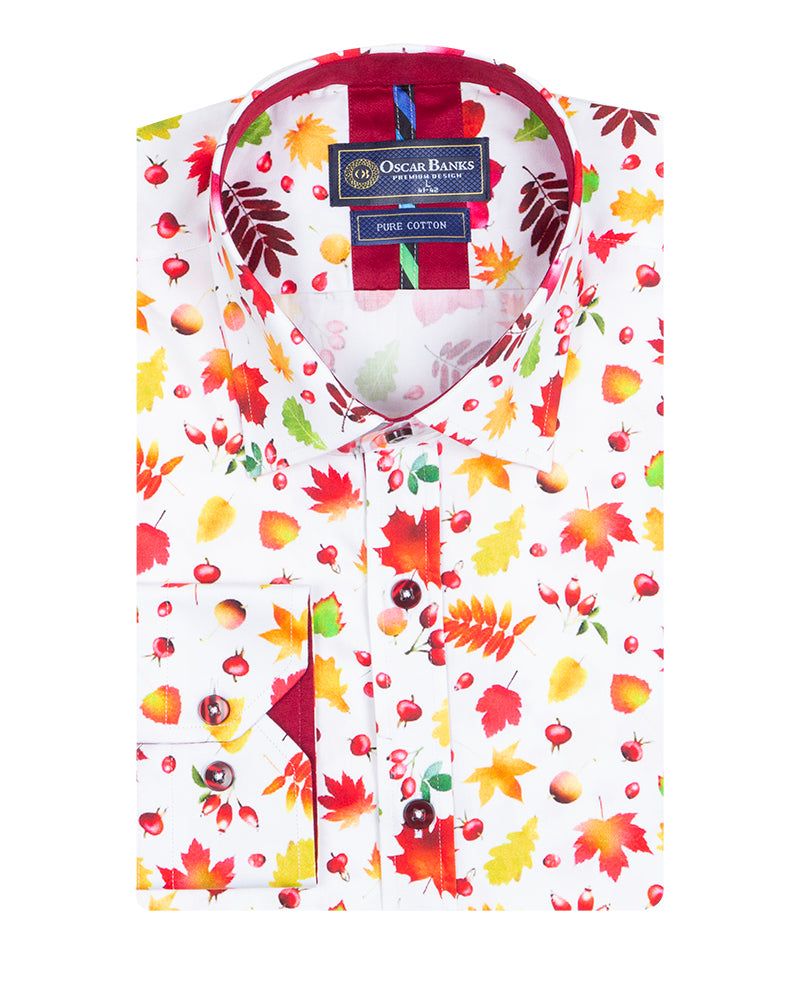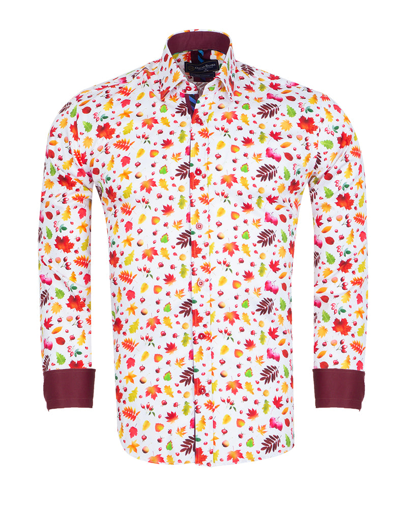 The shirt features a striking leaf print design, complemented by a contrasting collar and cuff for added flair. With single cuffs and two-button adjustable cuffs, it ensures a tailored look for any occasion.