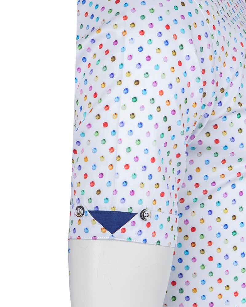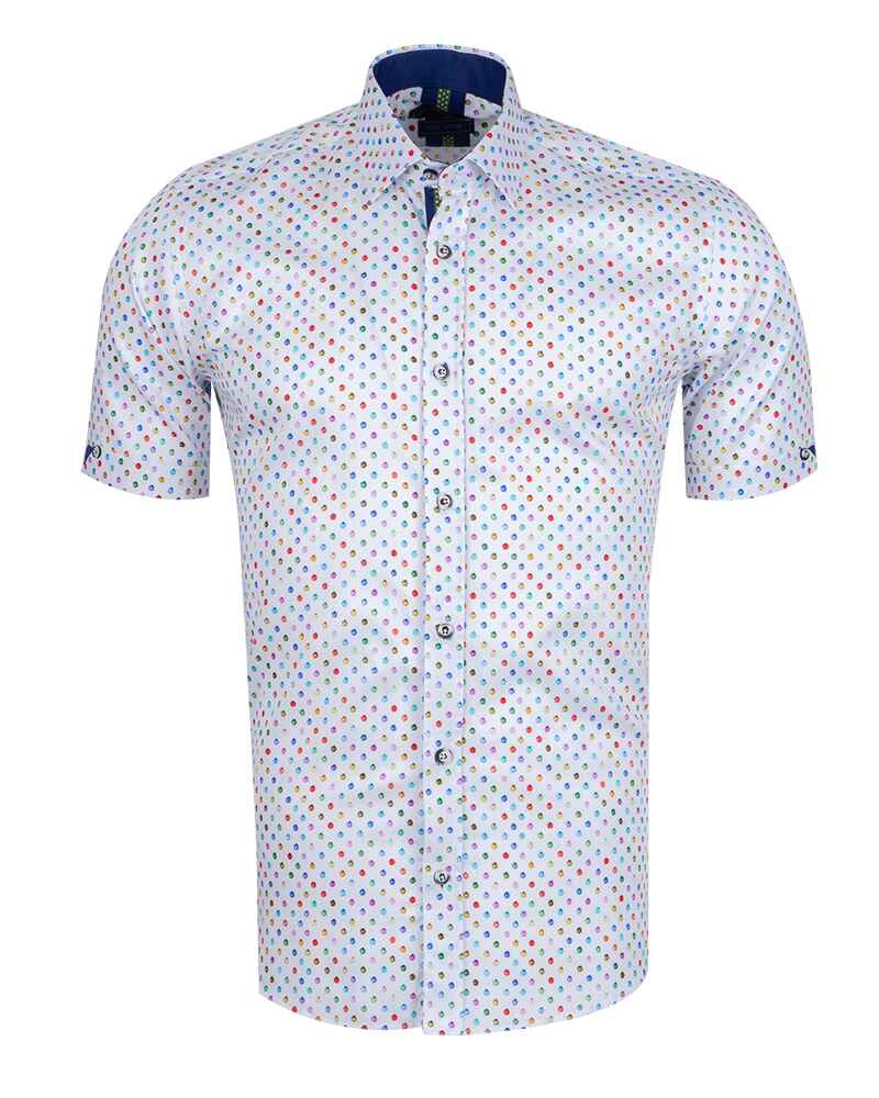 Introducing the White Colourful Polka Print Short Sleeve Shirt, a vibrant addition to your wardrobe. Made from 100% satin cotton, this shirt offers both comfort and style.