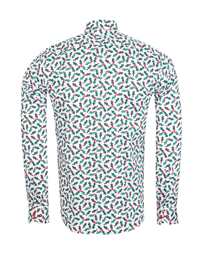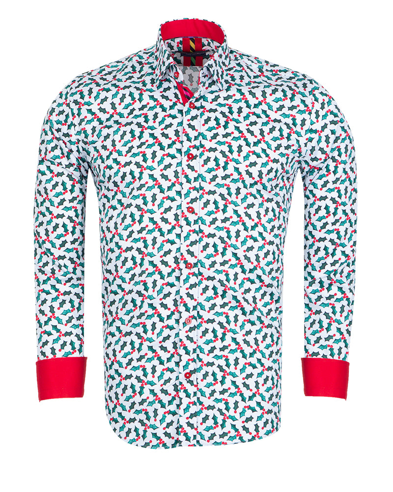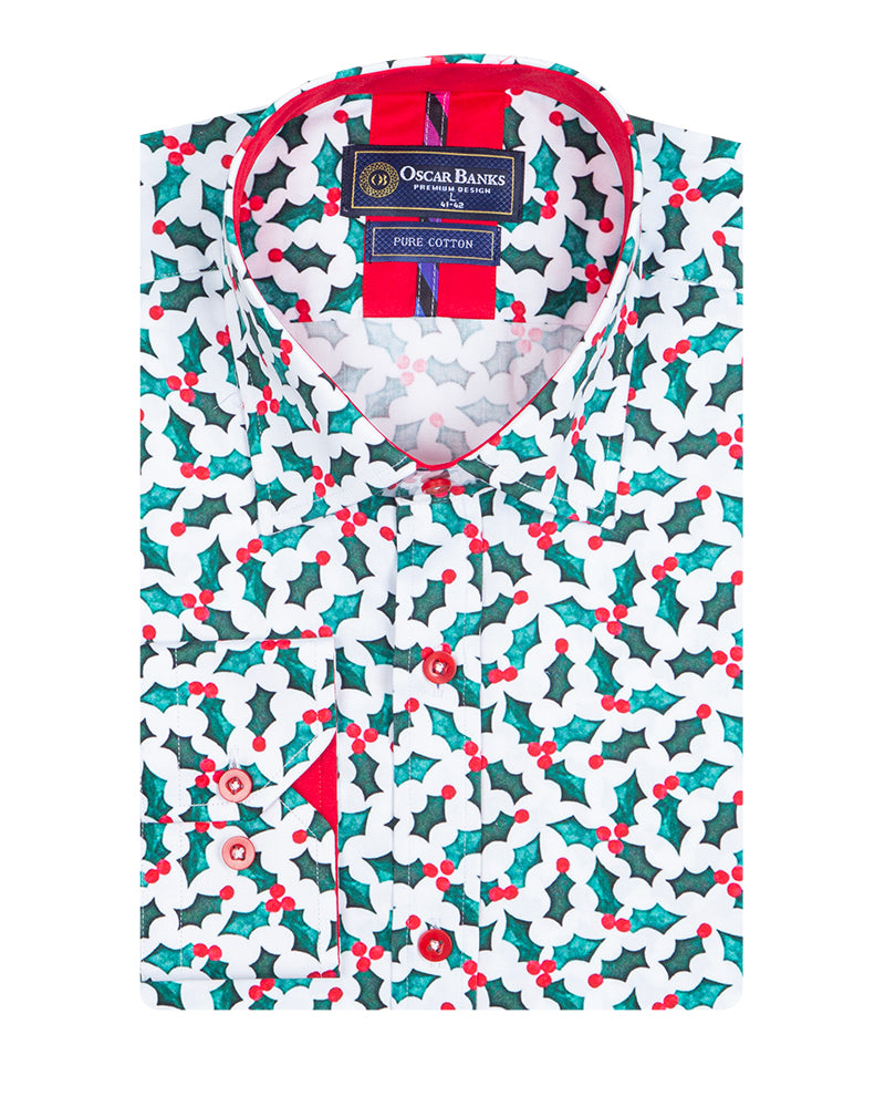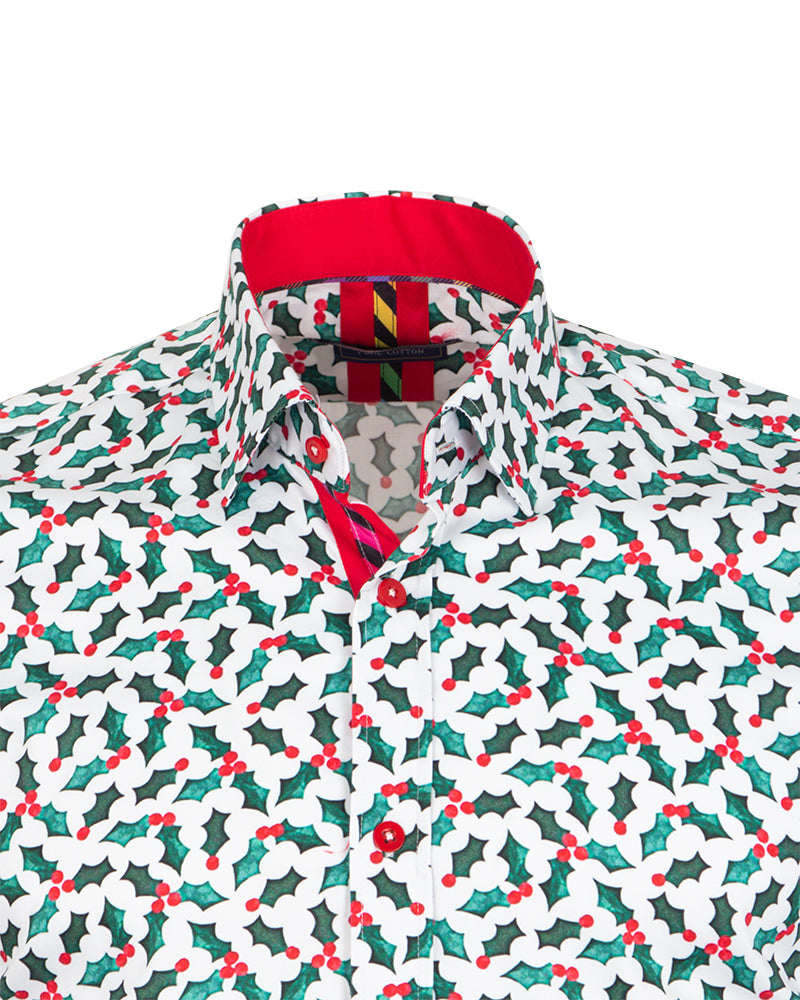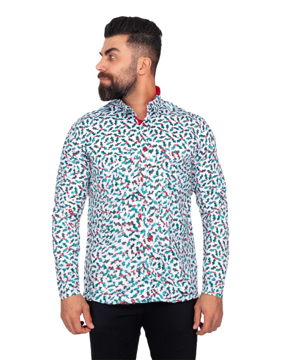 The shirt features a striking holly leaf print, complemented by a contrasting collar and cuff for a modern touch. With single cuffs and two-button adjustable cuffs, it ensures a tailored fit for any occasion.