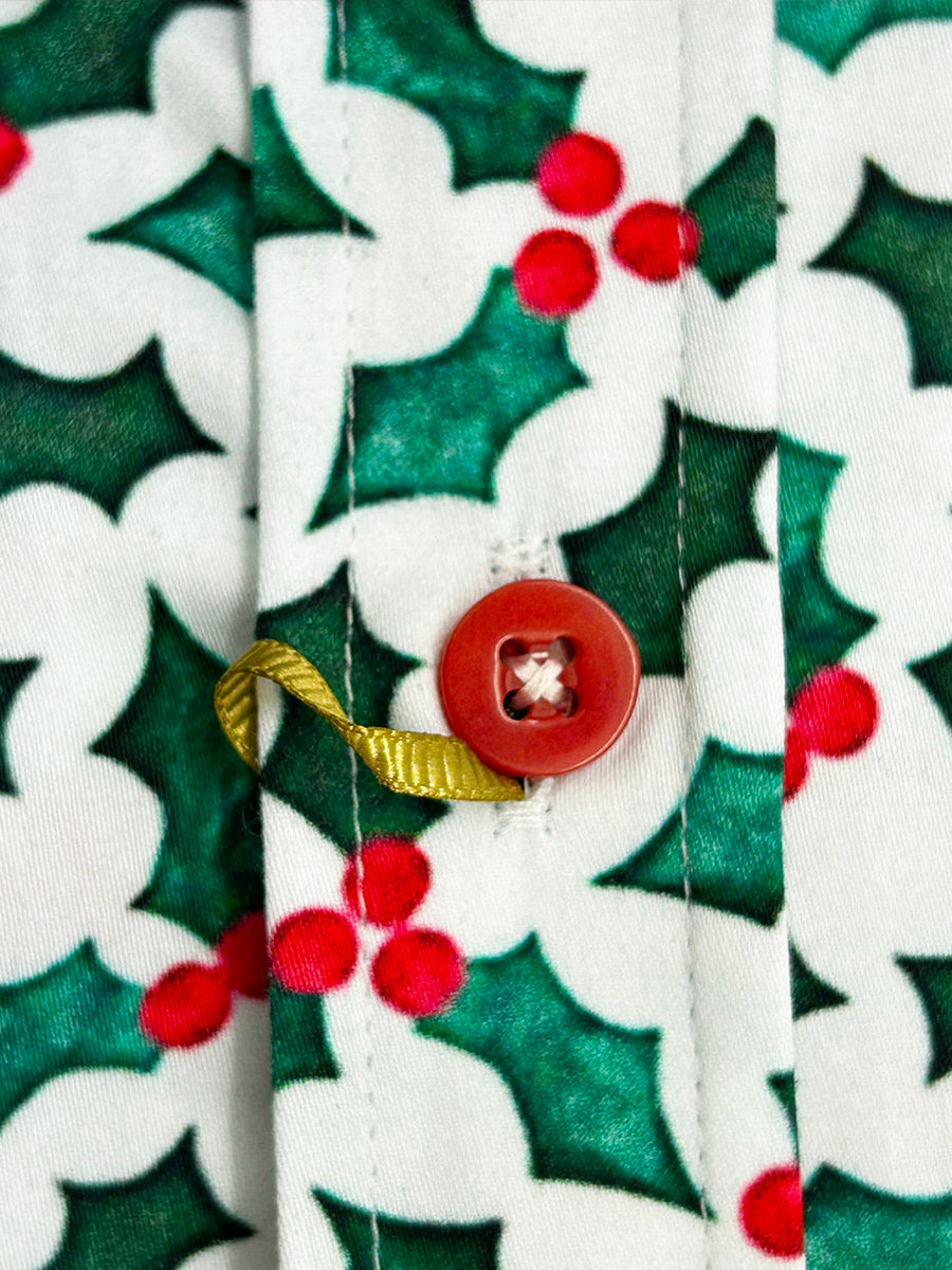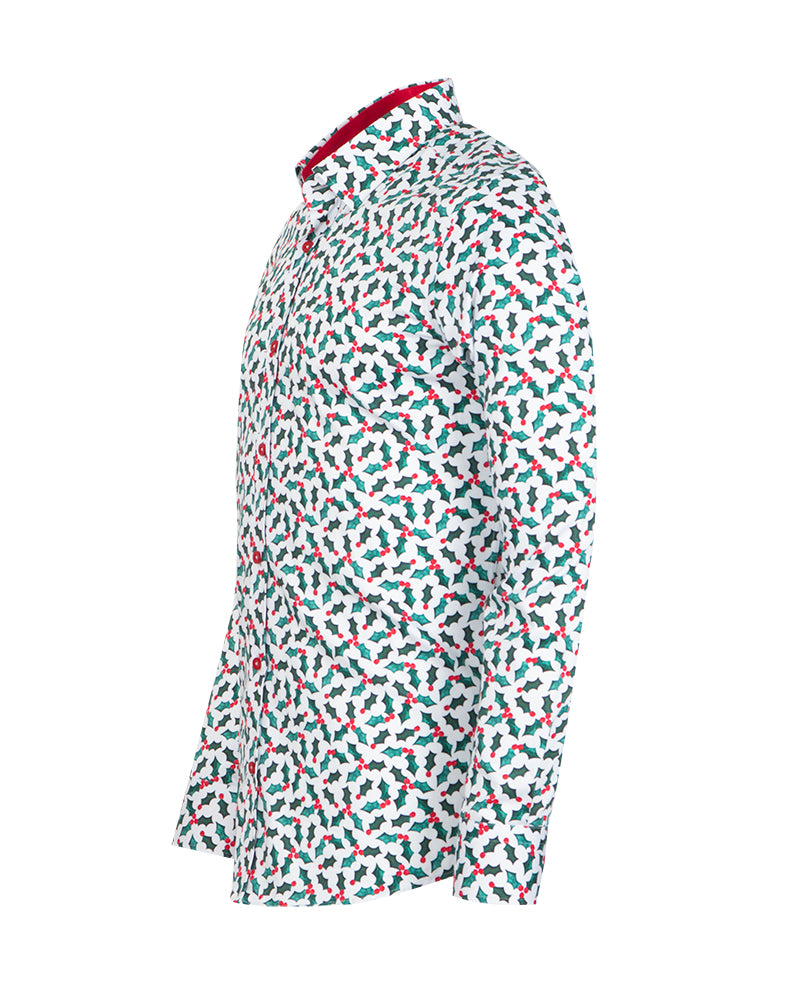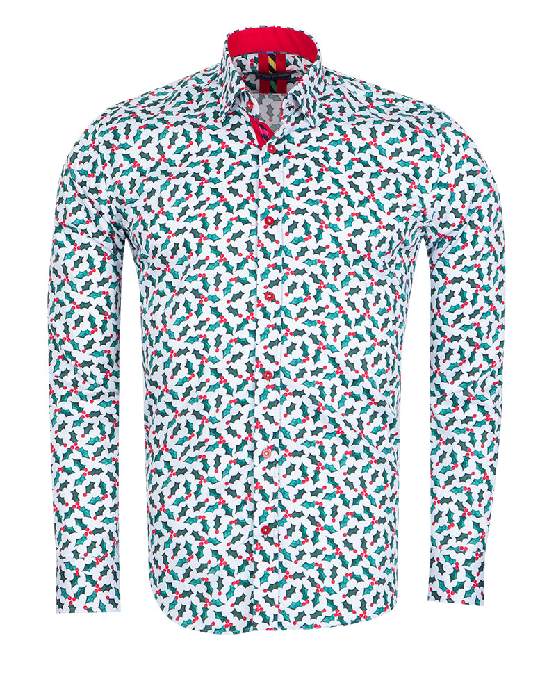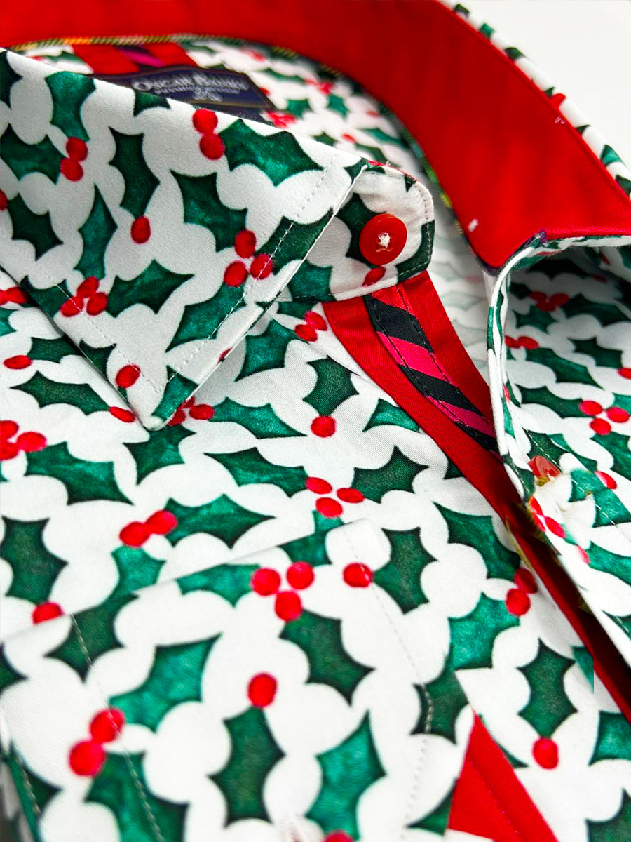 The shirt features a striking holly leaf print, complemented by a contrasting collar and cuff for a modern touch. With single cuffs and two-button adjustable cuffs, it ensures a tailored fit for any occasion.