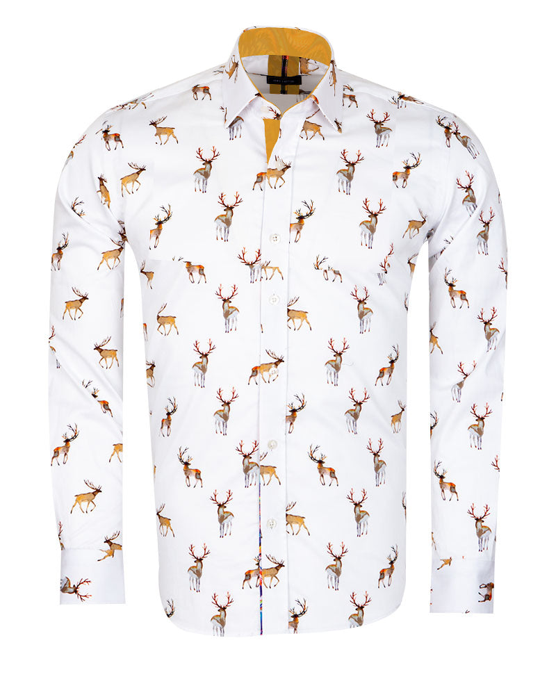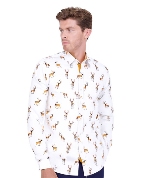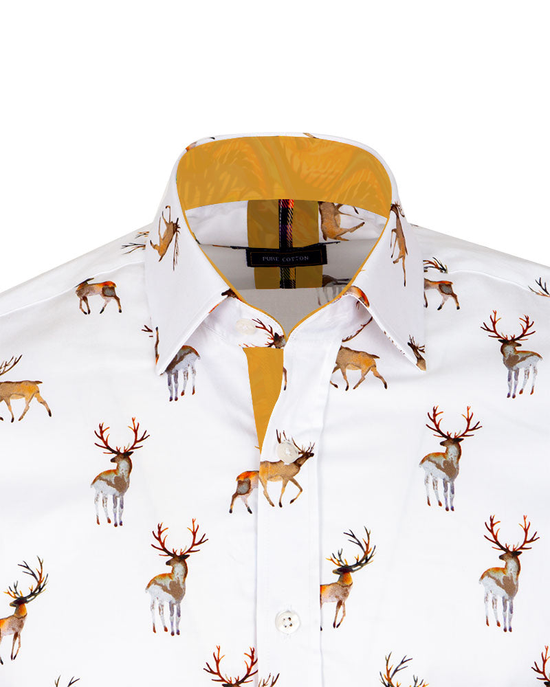 Elevate your festive wardrobe with the White Deer Print Men's Christmas Shirt, complete with a matching handkerchief. This stylish shirt is crafted from 100% satin cotton, ensuring both comfort and elegance.