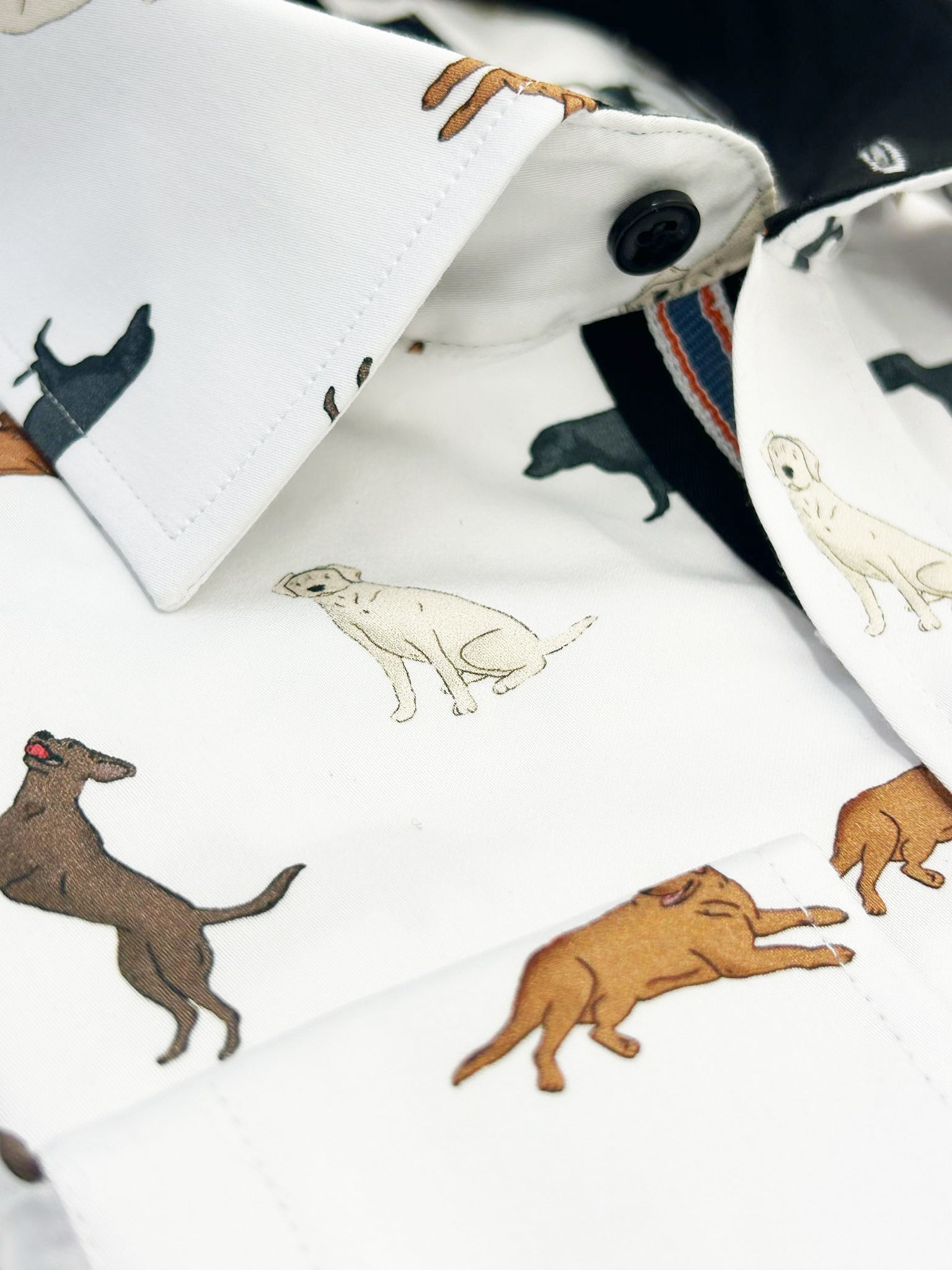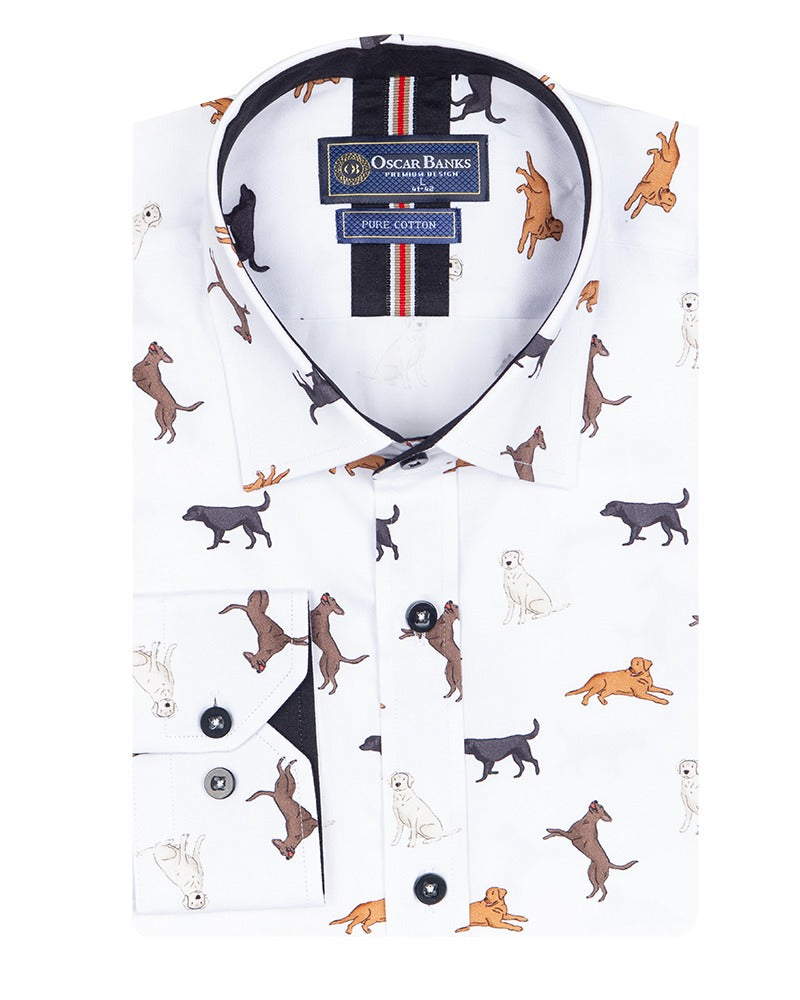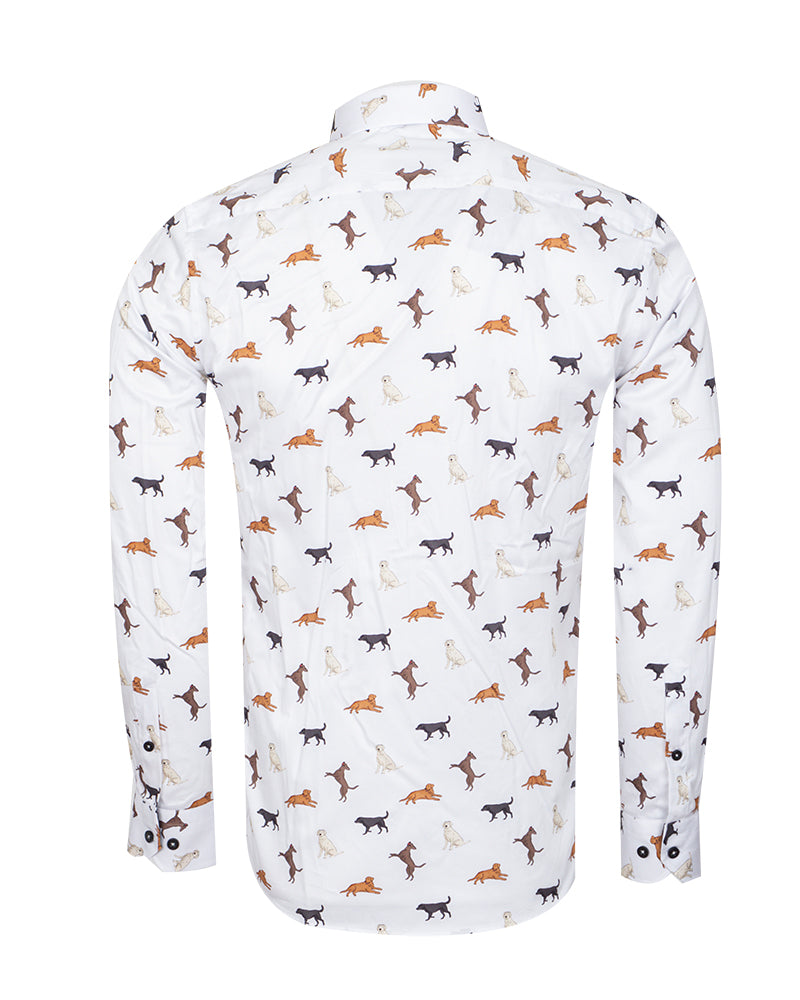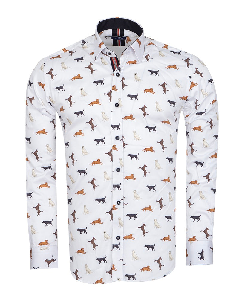 Introducing the White Dog Print with Matching Handkerchief, a stylish addition to your wardrobe. Crafted from 100% satin cotton, this shirt offers both comfort and elegance.