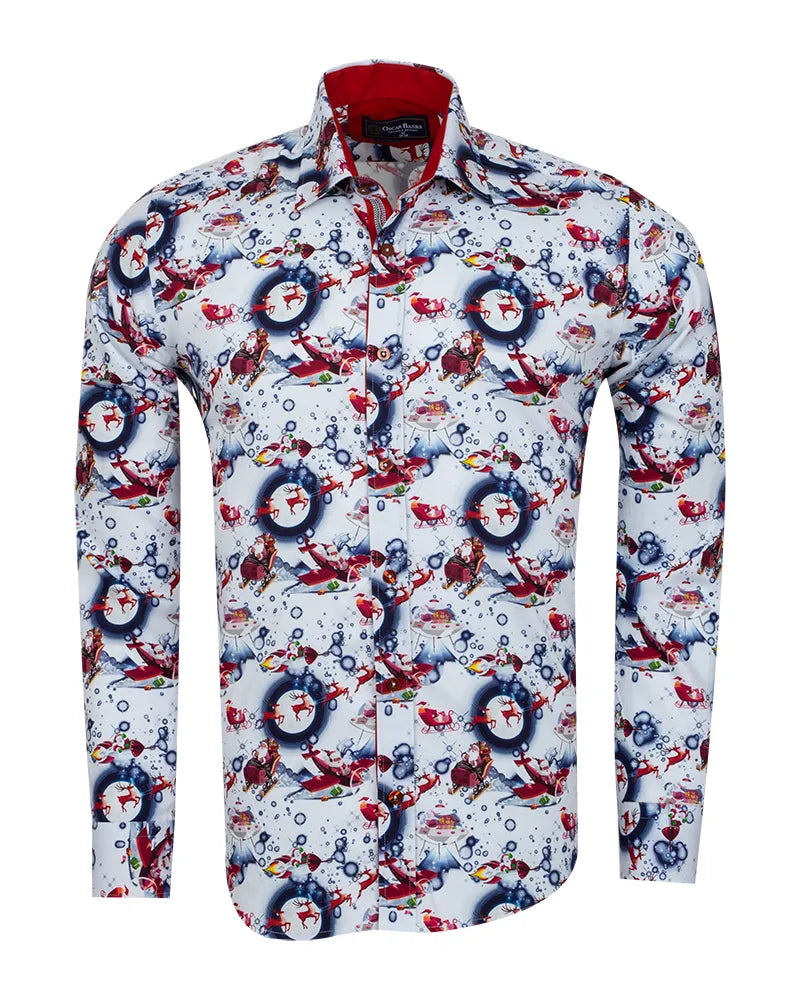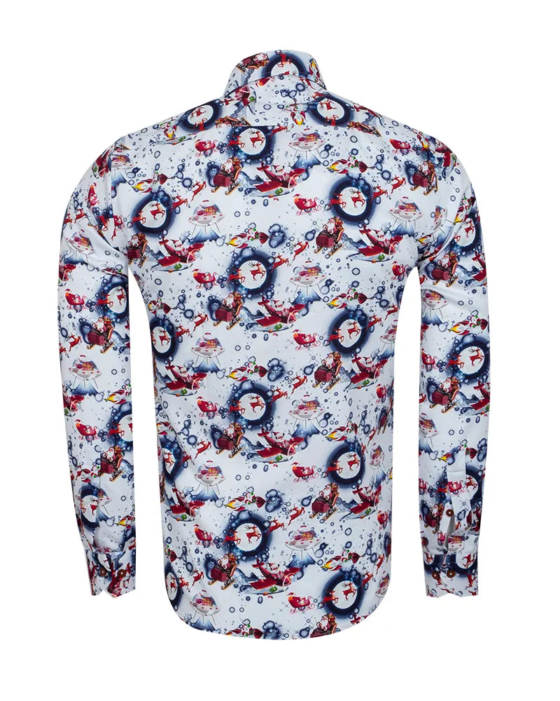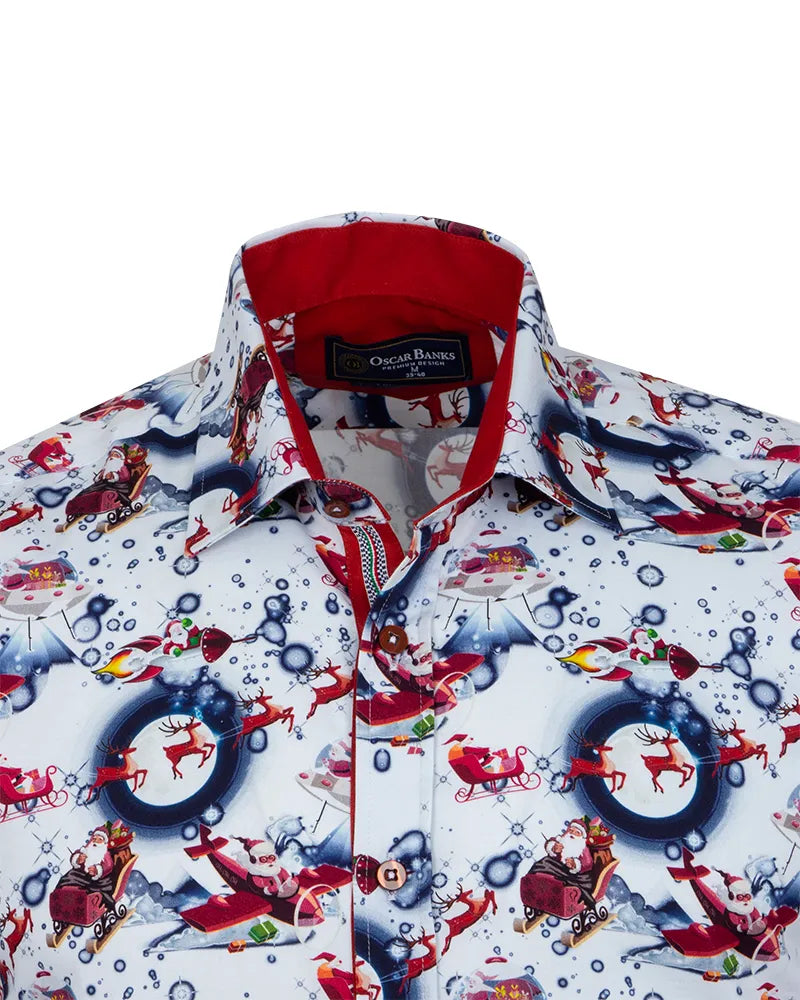 Introducing the White Festive Santa Print Shirt with Matching Handkerchief, a truly unique addition to your wardrobe. Crafted from 100% satin cotton, this shirt offers a luxurious feel while ensuring comfort throughout the day.