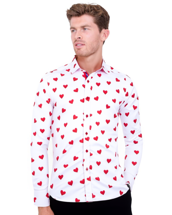 Introducing the White Heart Print Shirt, a stylish addition to your wardrobe. This shirt features a charming heart print that adds a playful touch to your outfit.