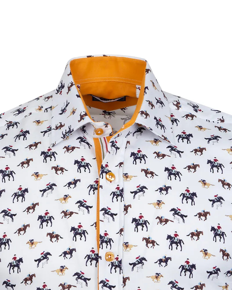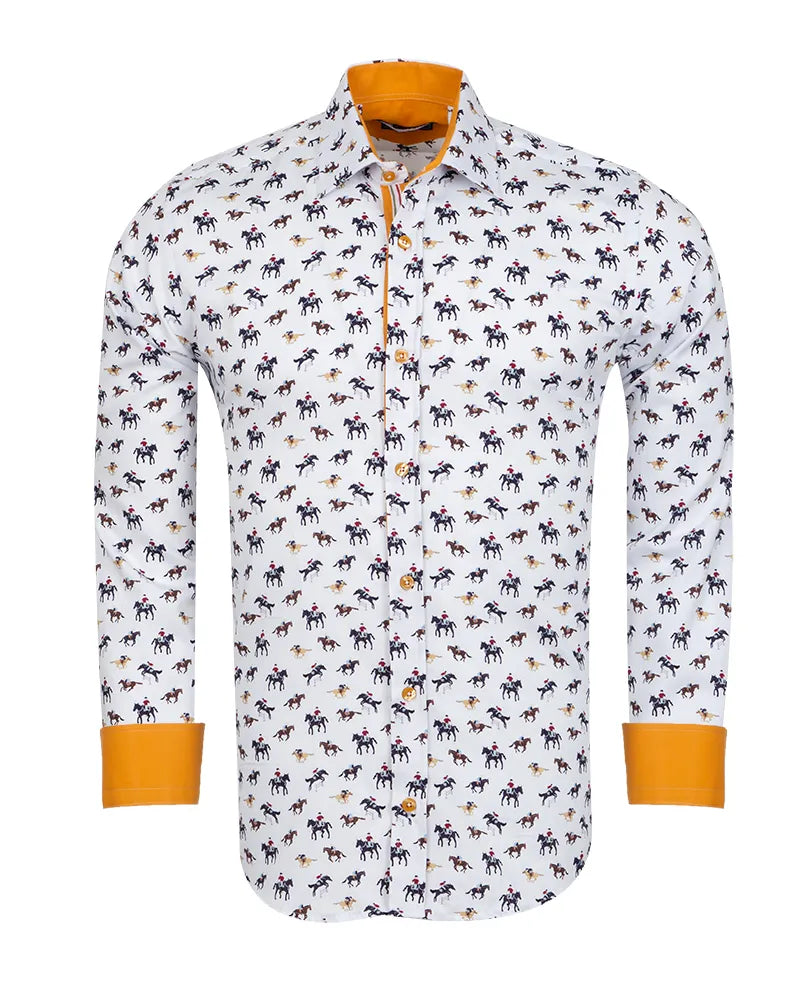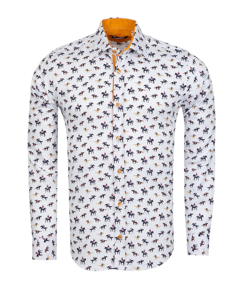 Introducing the White Horse Print Shirt with Matching Handkerchief, a truly unique addition to your wardrobe. Crafted from 100% satin cotton, this shirt offers a luxurious feel while ensuring comfort throughout the day.