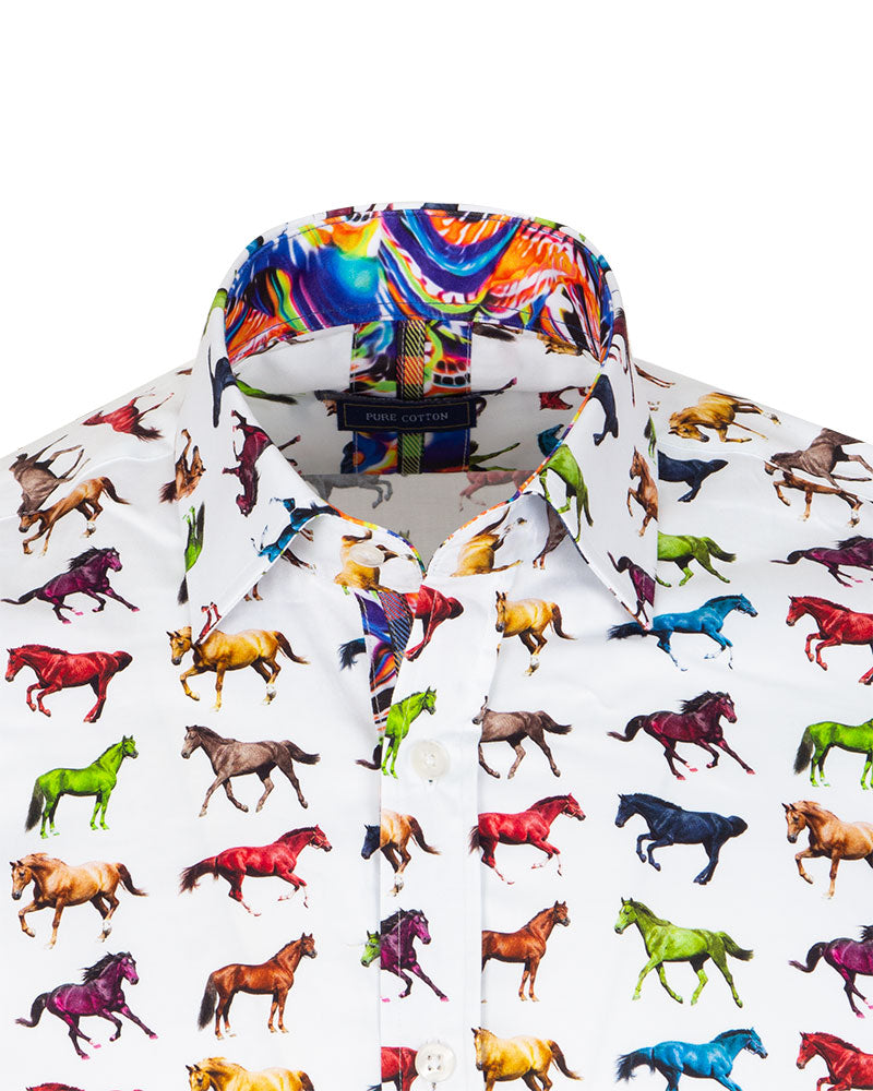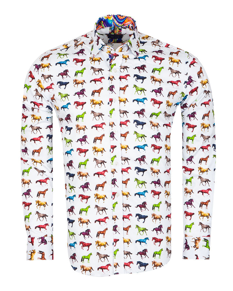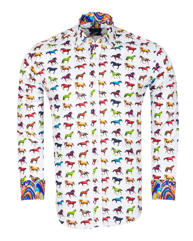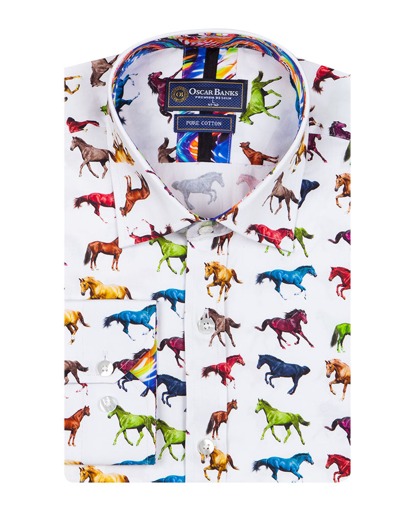 Discover the elegance of the White Horse Print with Matching Handkerchief, a perfect addition to your wardrobe. Crafted from 100% satin cotton, this shirt offers a luxurious feel and a stylish look.