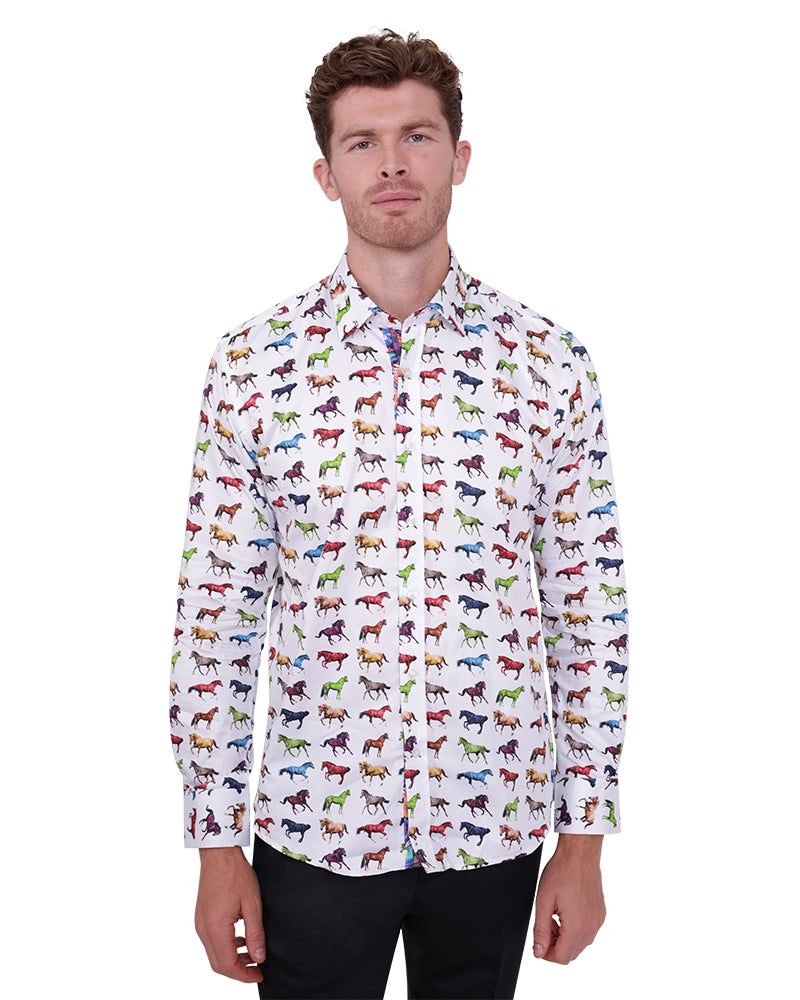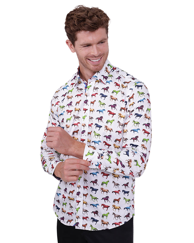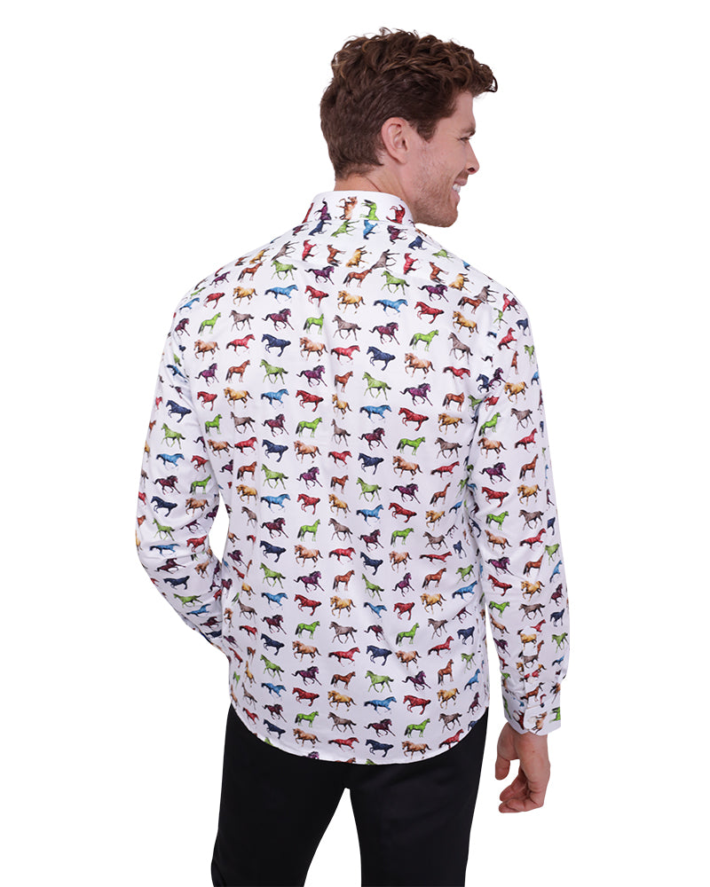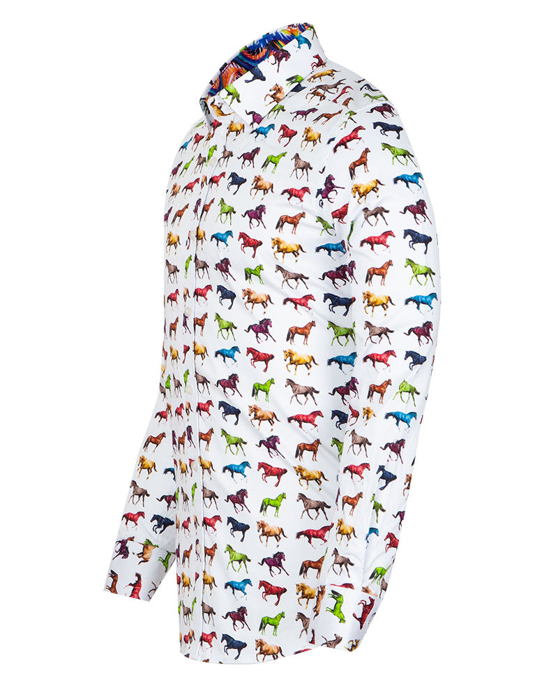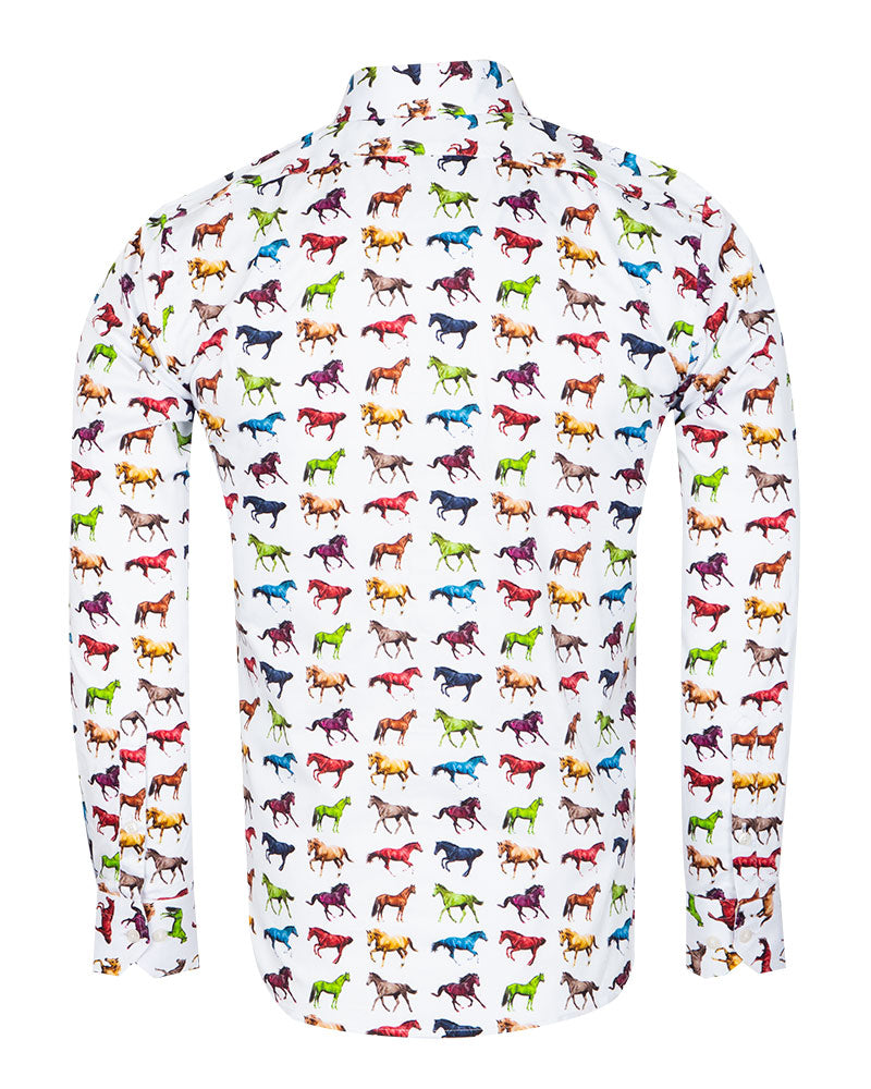 Discover the elegance of the White Horse Print with Matching Handkerchief, a perfect addition to your wardrobe. Crafted from 100% satin cotton, this shirt offers a luxurious feel and a stylish look.