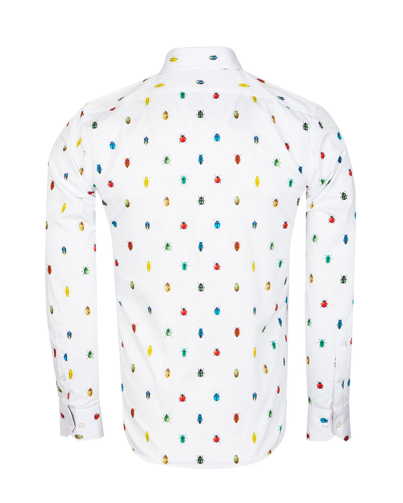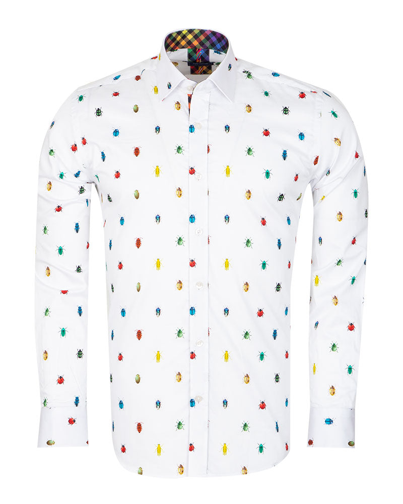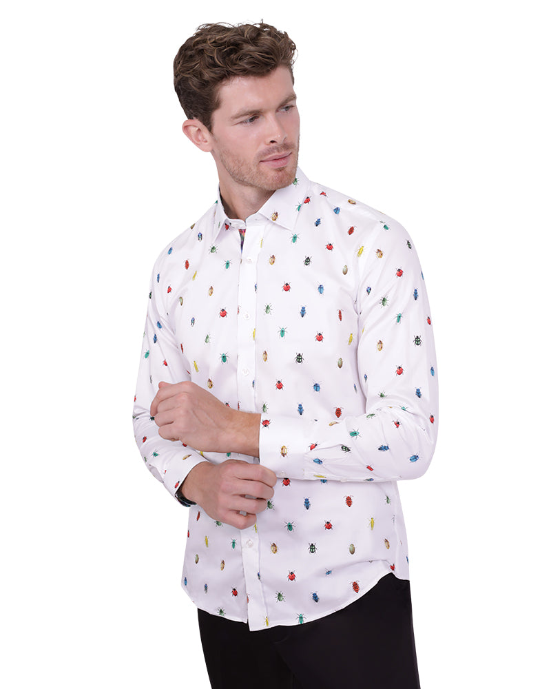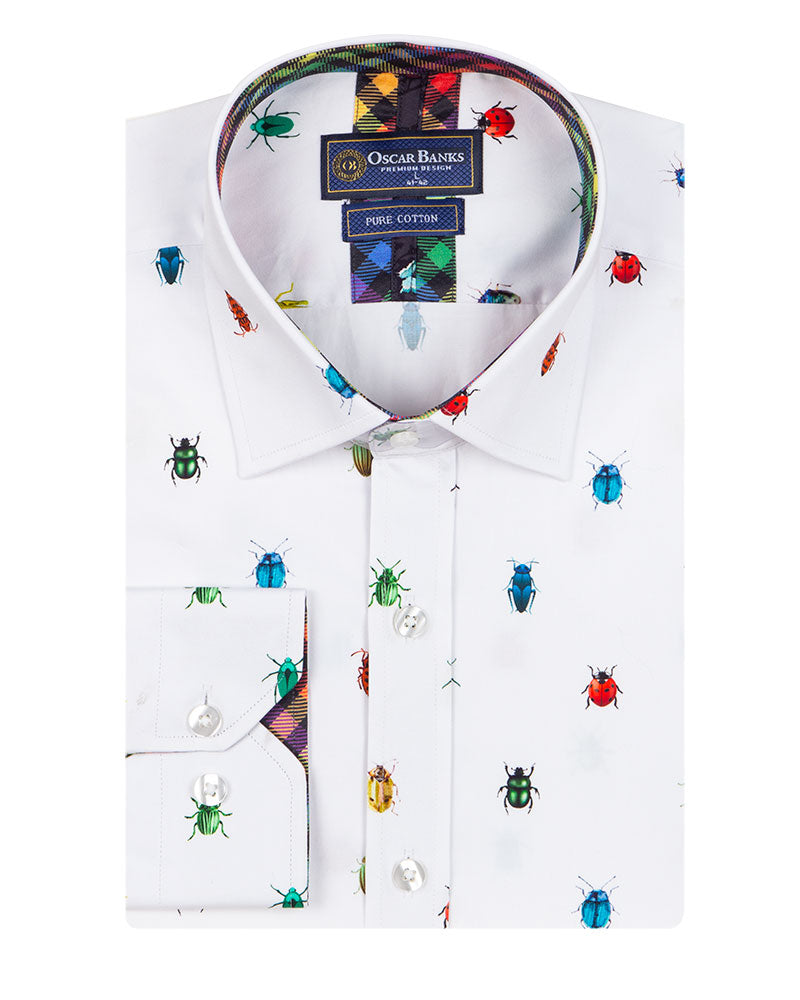 Introducing the White Colourful Insect Print with Matching Handkerchief, a unique addition to your wardrobe. Crafted from 100% satin cotton, this shirt offers both comfort and style.