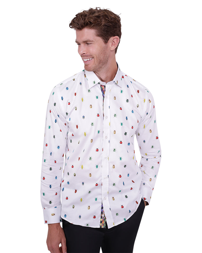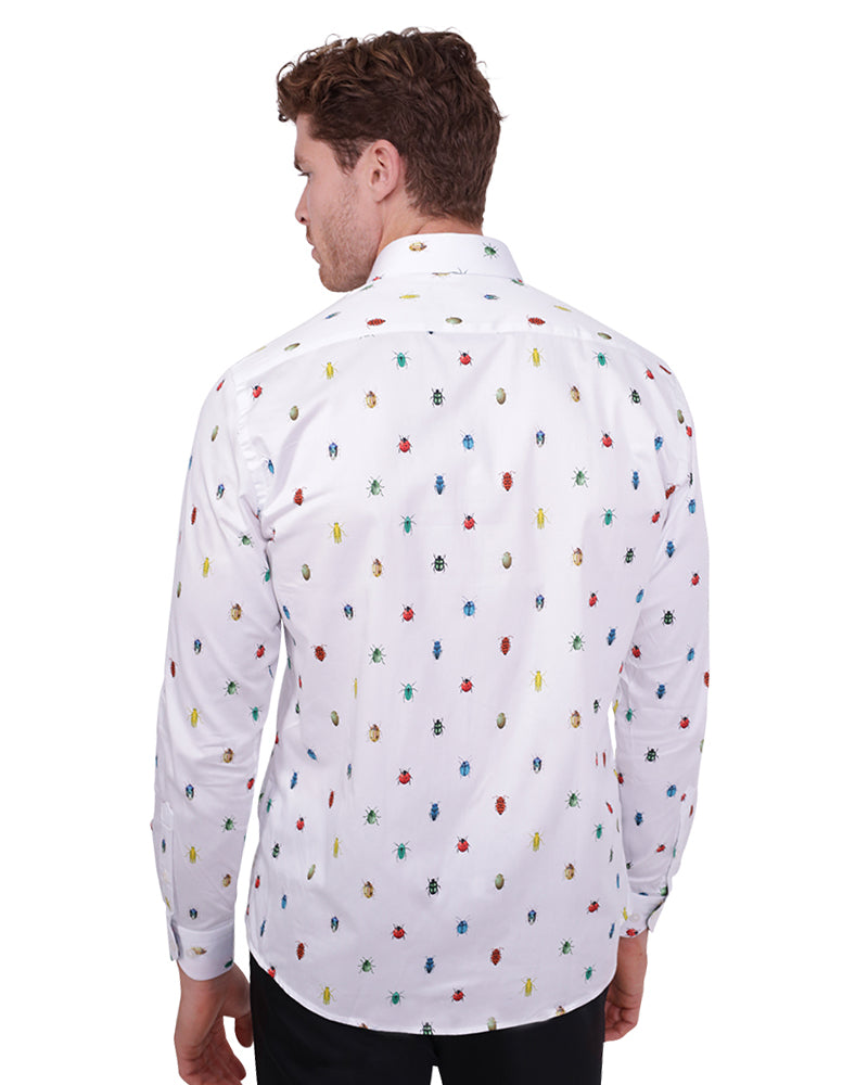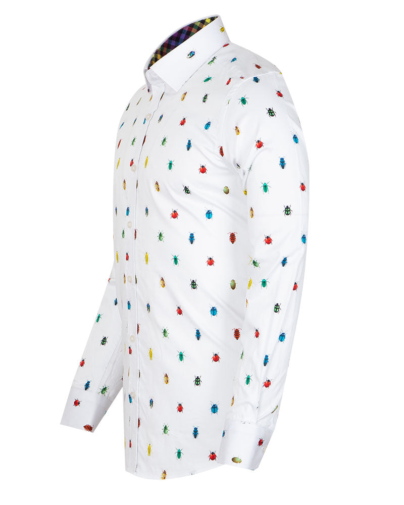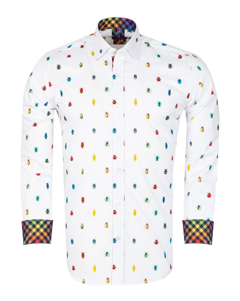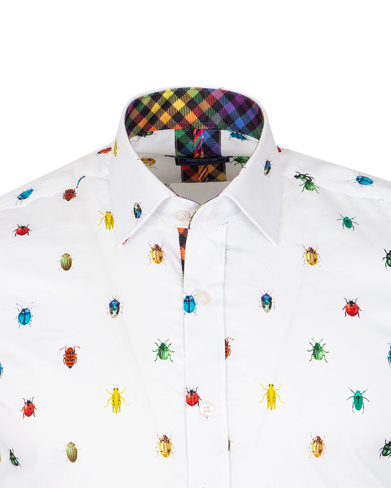 Introducing the White Colourful Insect Print with Matching Handkerchief, a unique addition to your wardrobe. Crafted from 100% satin cotton, this shirt offers both comfort and style.