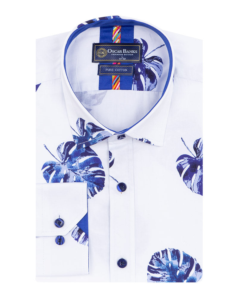 White Blue Leaf Print Shirt with Matching Handkerchief