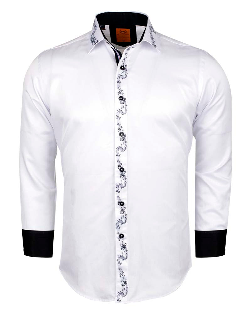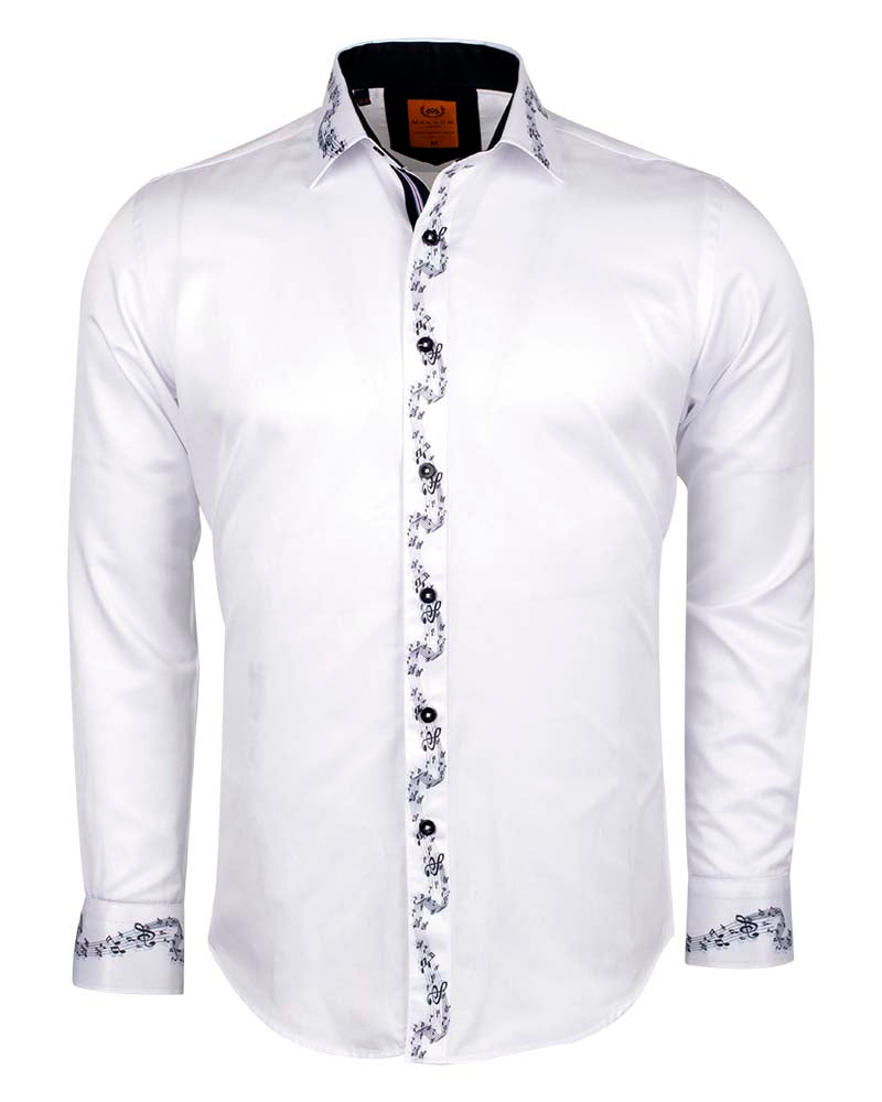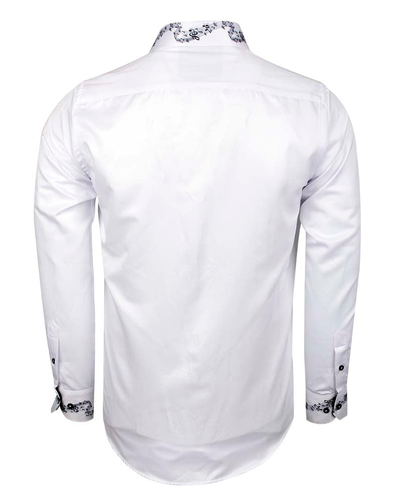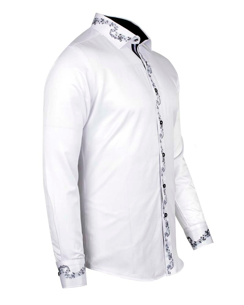 Introducing the White Musical Print Long Sleeve Shirt, a stylish addition to your wardrobe. This fashion shirt features a unique contrasting front panel, complemented by a striking stripe and tartan collar tip design.