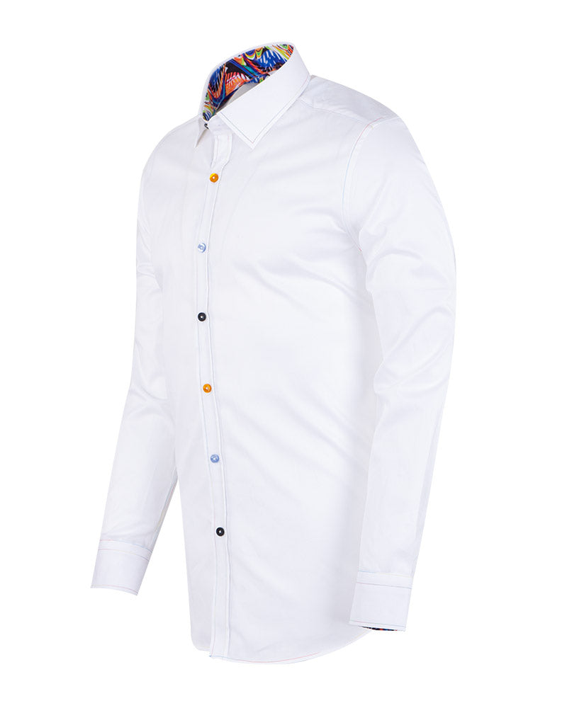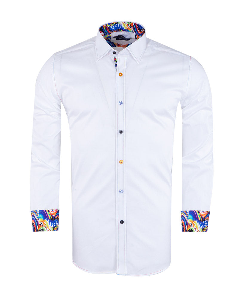 White Plain Panel Colourful Print Collar Tip Pure Cotton Shirt