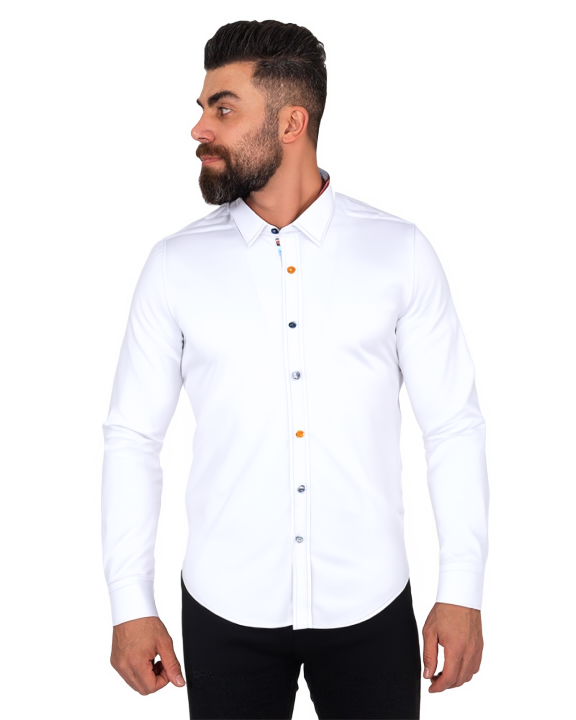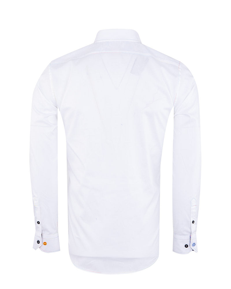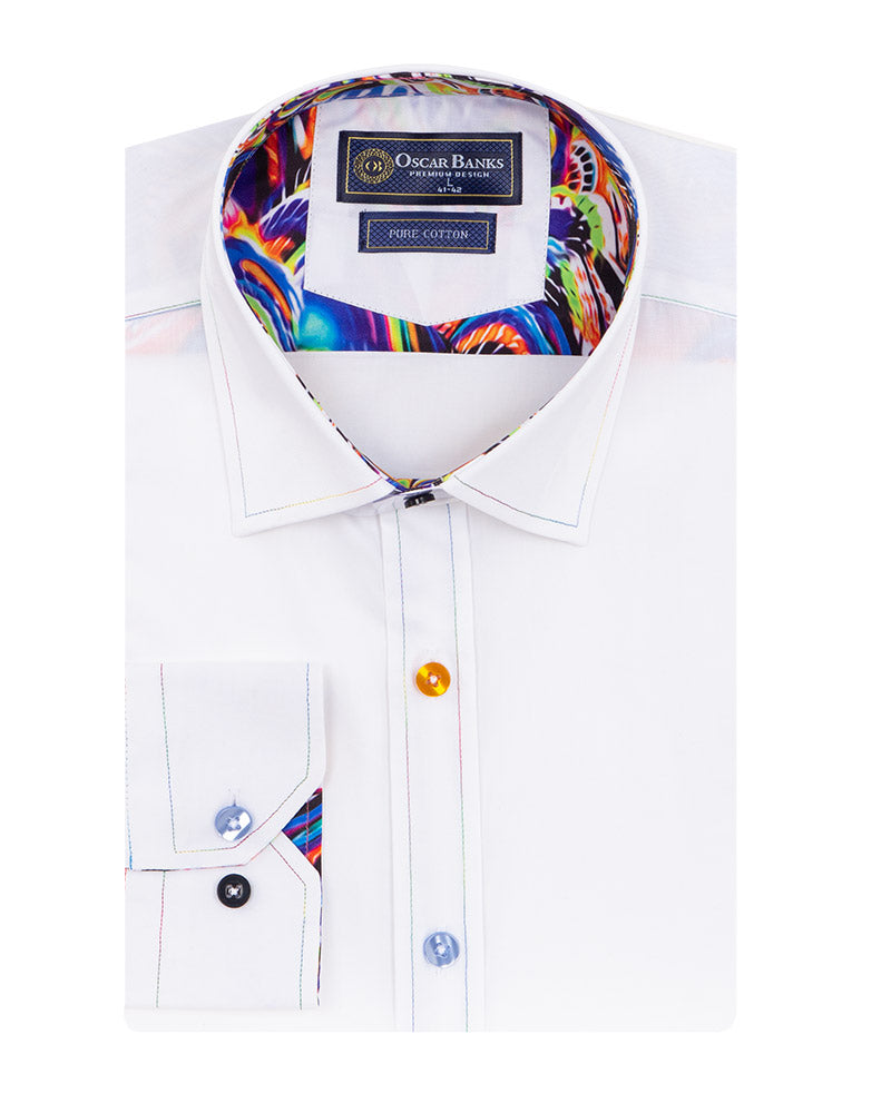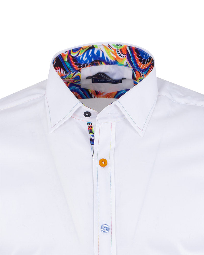 Introducing the White Plain Panel Colourful Print Collar Tip Pure Cotton Shirt, a stylish addition to any wardrobe. This shirt features a sleek plain panel design, perfect for both casual and formal occasions.