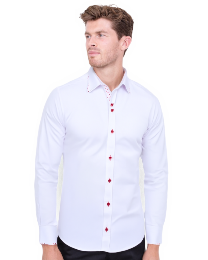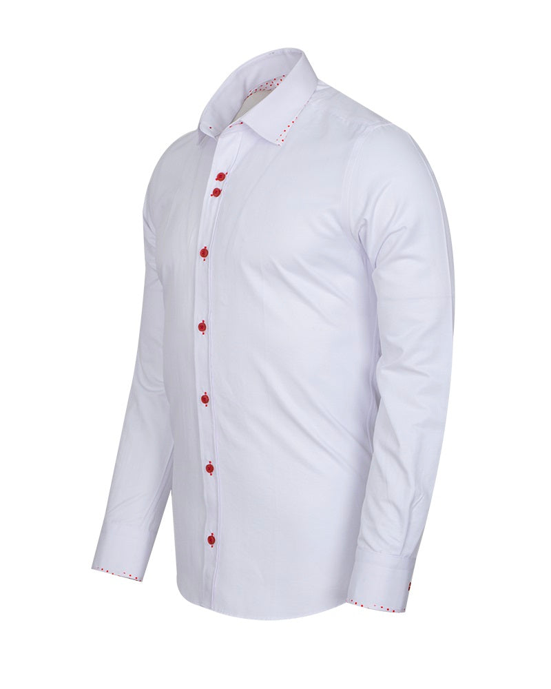 Introducing the White Plain Panel Shirt with Red Dot Print Collar & Cuffs, a stylish addition to your wardrobe. This shirt features a classic white base, enhanced by a unique dot print on the collar and cuffs, making it perfect for both casual and formal occasions.