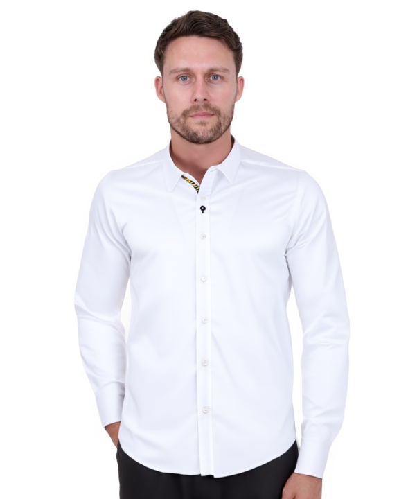 Introducing the Plain White Shirt with Colourful Stripe Insert, a stylish addition to your wardrobe. This long sleeve shirt features a classic plain design, perfect for both casual and formal occasions.