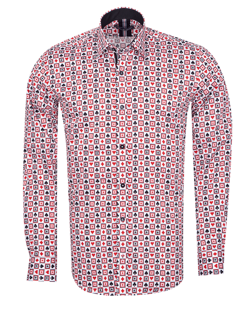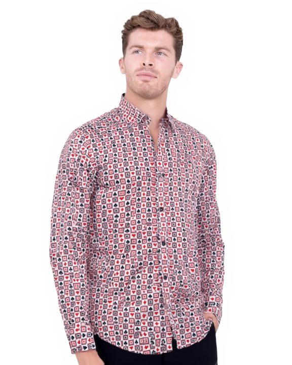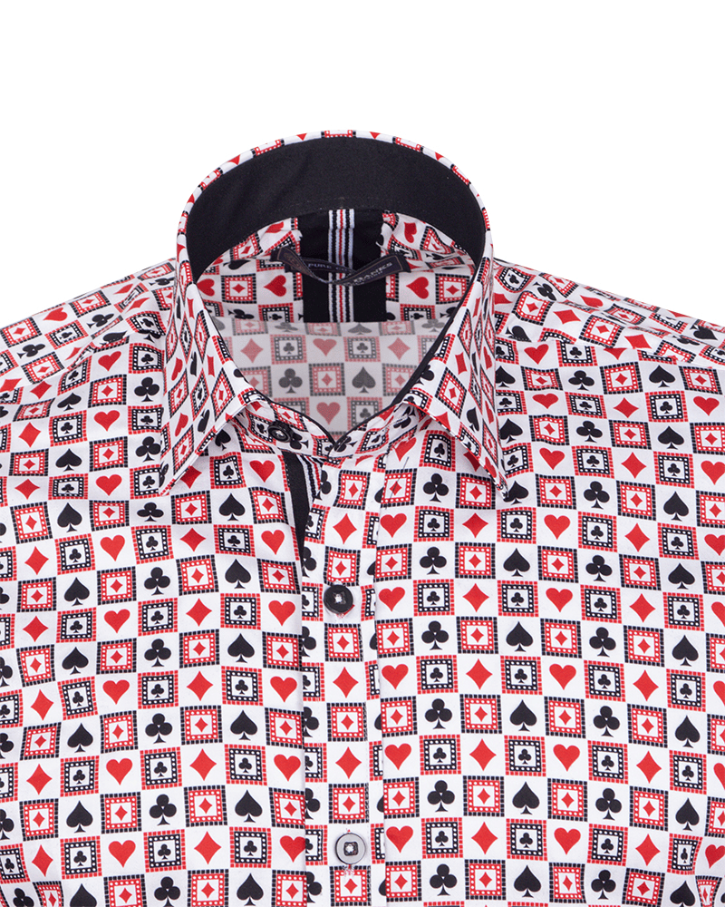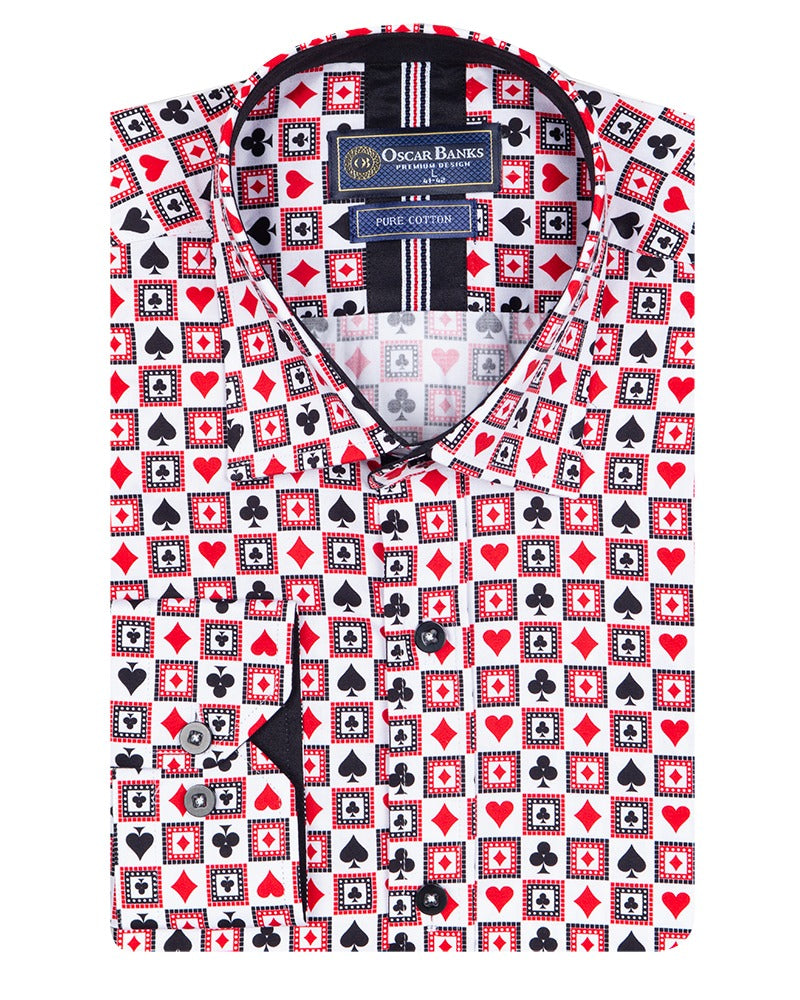 Introducing the White Playing Card Symbols Print with Matching Handkerchief, a truly unique addition to your wardrobe. Crafted from 100% satin cotton, this shirt offers both comfort and style, making it perfect for any occasion.