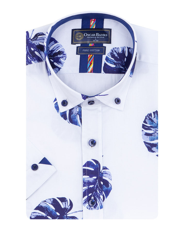 Introducing the White Tropical Palm Leaf Print Short Sleeve Shirt, a perfect blend of style and comfort. Crafted from 100% satin cotton, this shirt offers a luxurious feel against the skin.