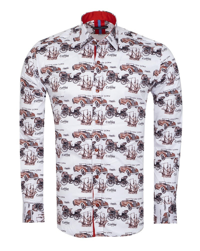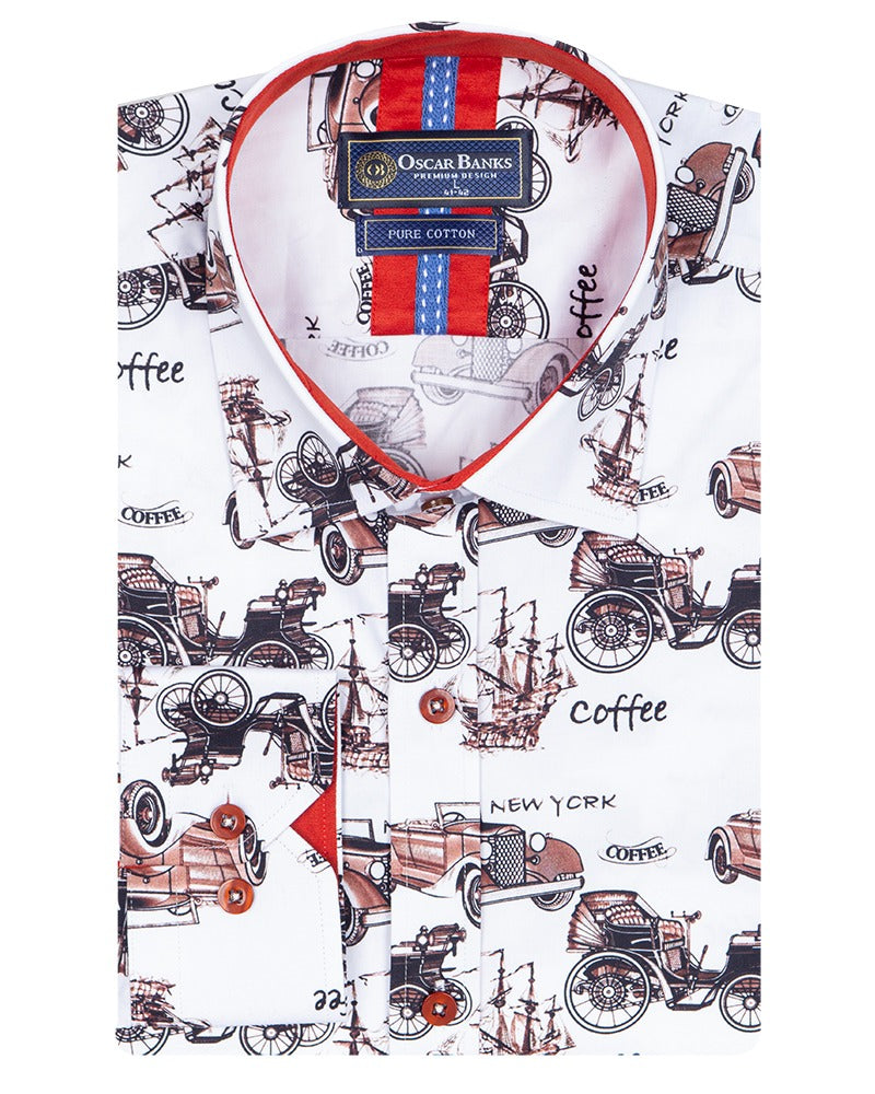Introducing the White Vintage Cars Print with Matching Handkerchief, a truly unique addition to your wardrobe. Crafted from 100% satin cotton, this shirt offers both comfort and style, making it perfect for any occasion.