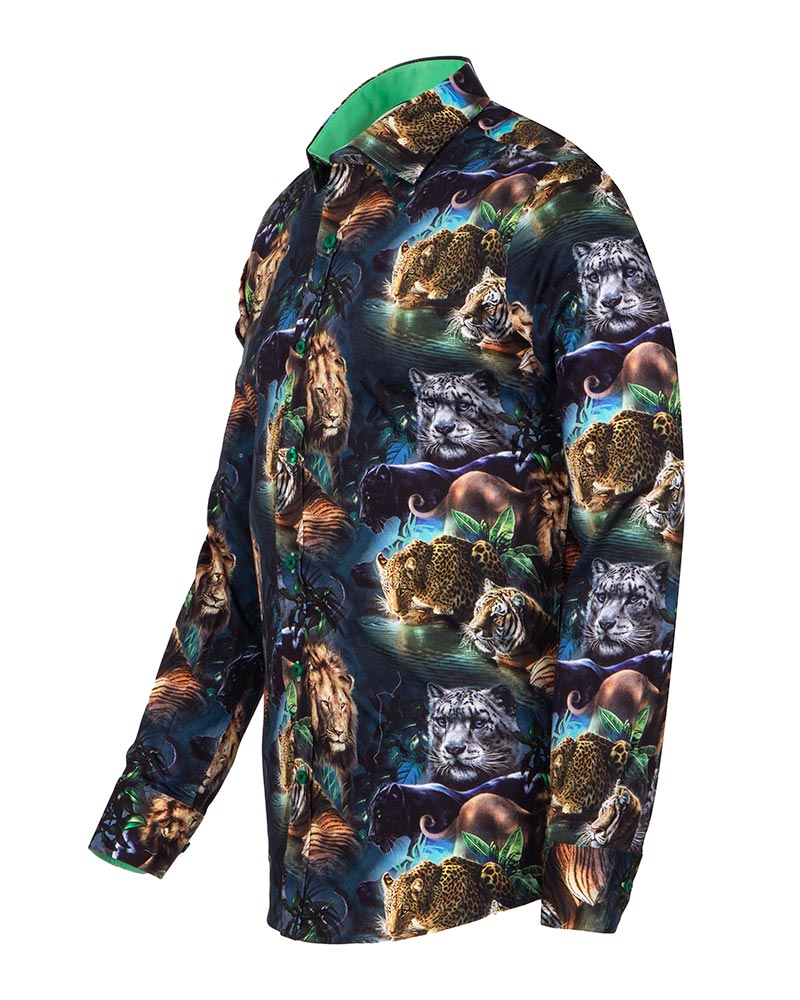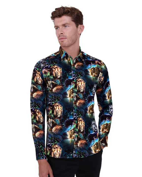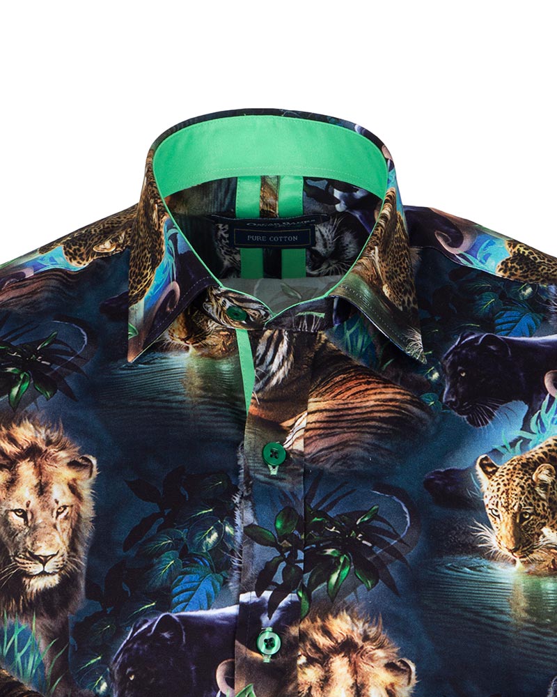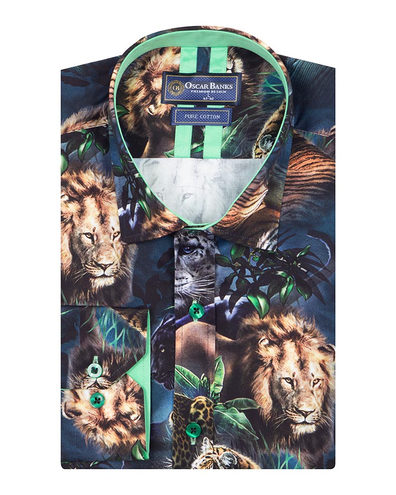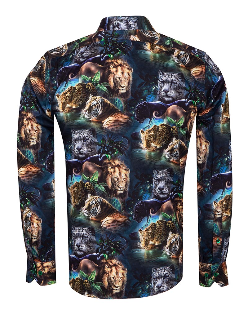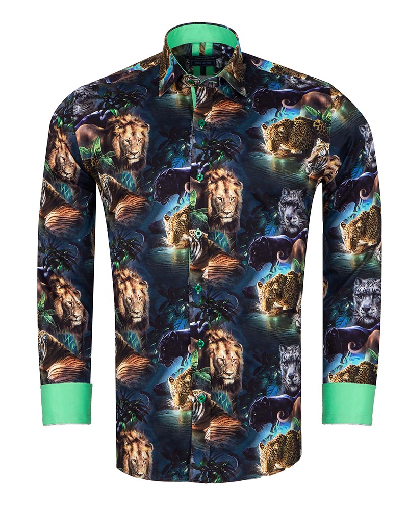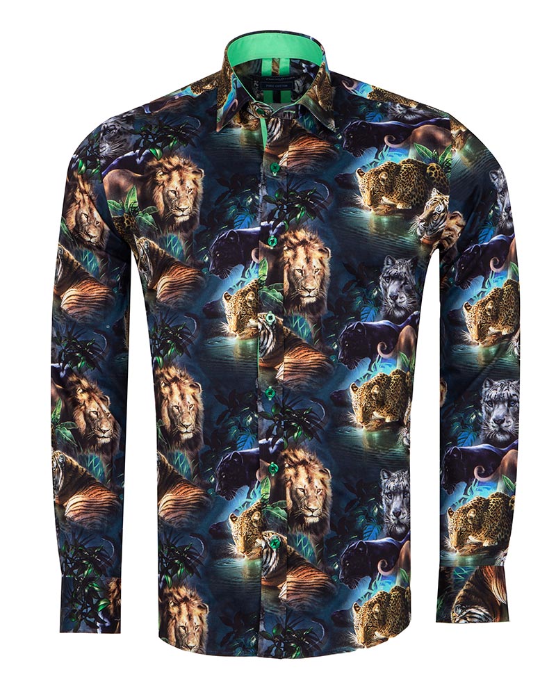 The shirt features a striking wild animal print, complemented by a contrasting collar and cuff for a sophisticated touch. The single cuff design includes two button adjustable cuffs, ensuring a perfect fit.